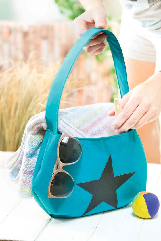 Then turn your carrier bag and close the turning opening with the straight stitch. Now fold the inner part into the outer fabric. Next, sew the handle of the bag. Place the two panels right sides together and sew the long sides together. Then turn the handle over and topstitch the long straight lines again with a narrow edge. Then turn the ends inside out and sew them to the inside of the bag. Finally, apply the table stars with iron-on fleece.