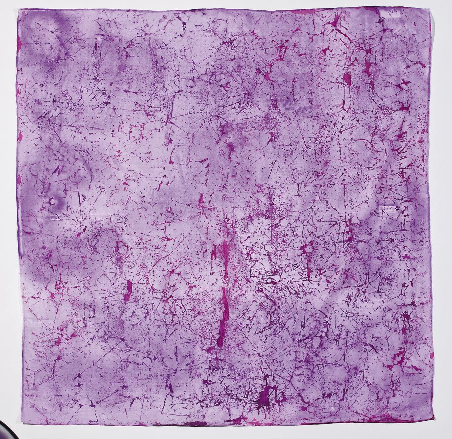Dilute the violet Silk paint very much (1 part paint to 20 parts water) and spray it on the cloth with the spray bottle. Tighten the cloth on the frame if necessary.