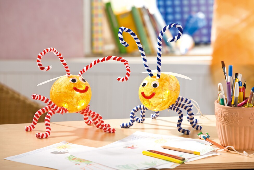 Now the fireflies still need only wings and a face. Cut out the wings with the help of the template, bend Lamp foil the mouth out of one piece. Now Chenille wire. glue on the only wings, mouth and eyes and your great fireflies are ready.