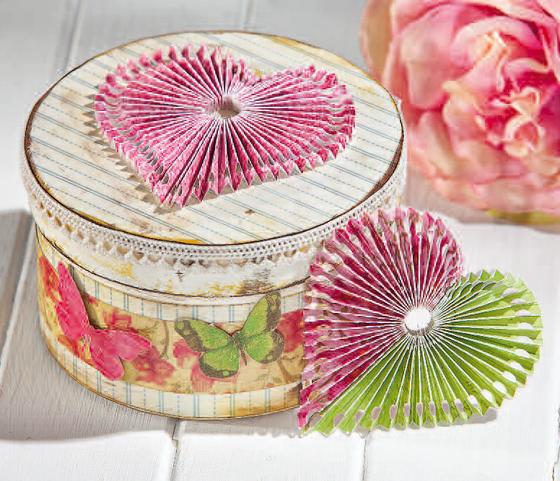The extraordinary hearts on the box are created with the help of a punching and embossing template. They are very versatile and can be used as a decoration on boxes or cards or can be given as a solo gift.