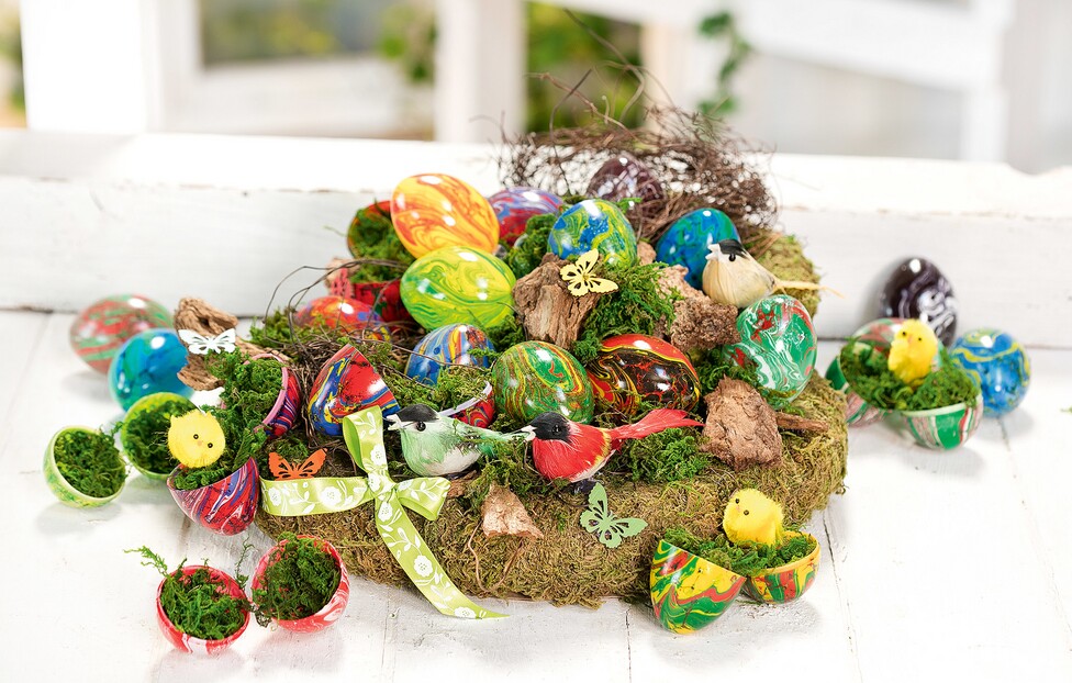 How do I make the Easter nest? While the marbled eggs are drying, you can start making the Easter nest. For this, first glue cardboard to both moss wreaths from below, <!-[if gte mso 9]>Normal021falsefalsefalseENX-NONEX-NONEMicrosoftInternetExplorer4<![endif]->stick the smaller wreath onto the large wreath and fill it with the dark green moss