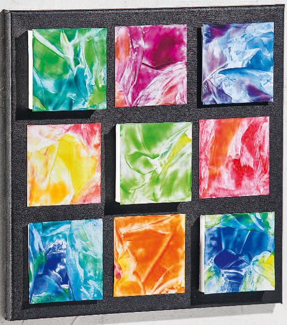 Polish the 9 encaustic pictures with a soft cloth and distribute them in different heights on the Stretched Canvas . For this, glue 2 painting cards with effect glue on two Painting boards glued on top of each other, 3 painting cards on a small Stretched Canvas, 4 painting cards directly with tape-Ribbon on the large Stretched Canvas.