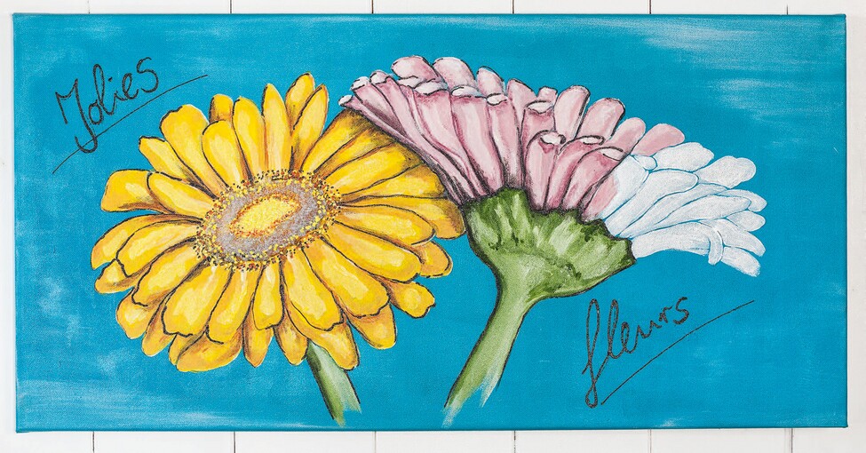 The Stretched Canvas "Jolies fleurs" was painted with two adorable gerberas. The beautiful motif, the luminosity of the artist's colours, the pleasant relaxation while painting will certainly inspire you to create further beautiful murals.