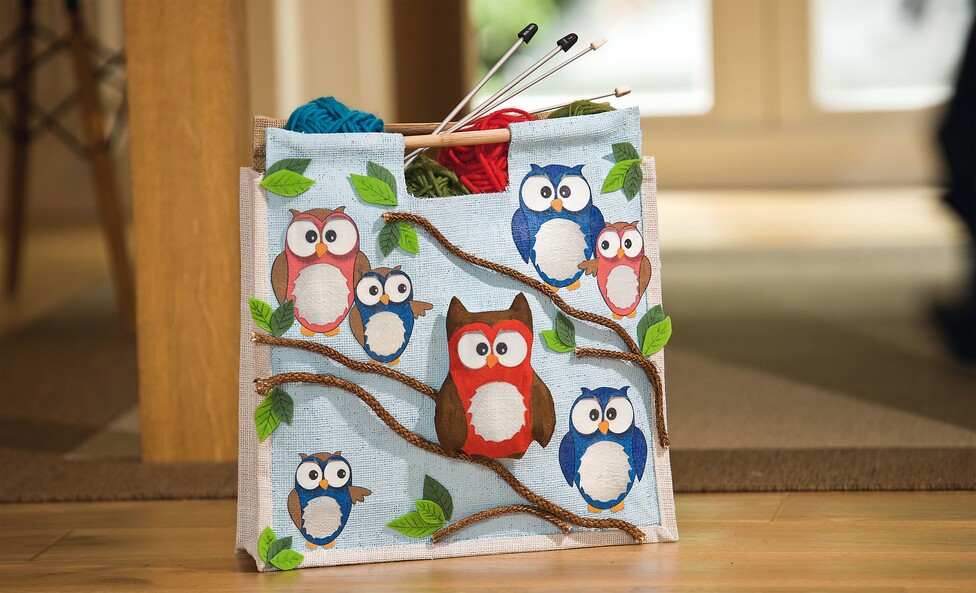 Design with Napkin technique a great owl bag. With only little effort the simple Jute-Bag a cheerful look. Use the bag for your handicraft items or take it with you when you go shopping, you will cut a good figure with it in any case.