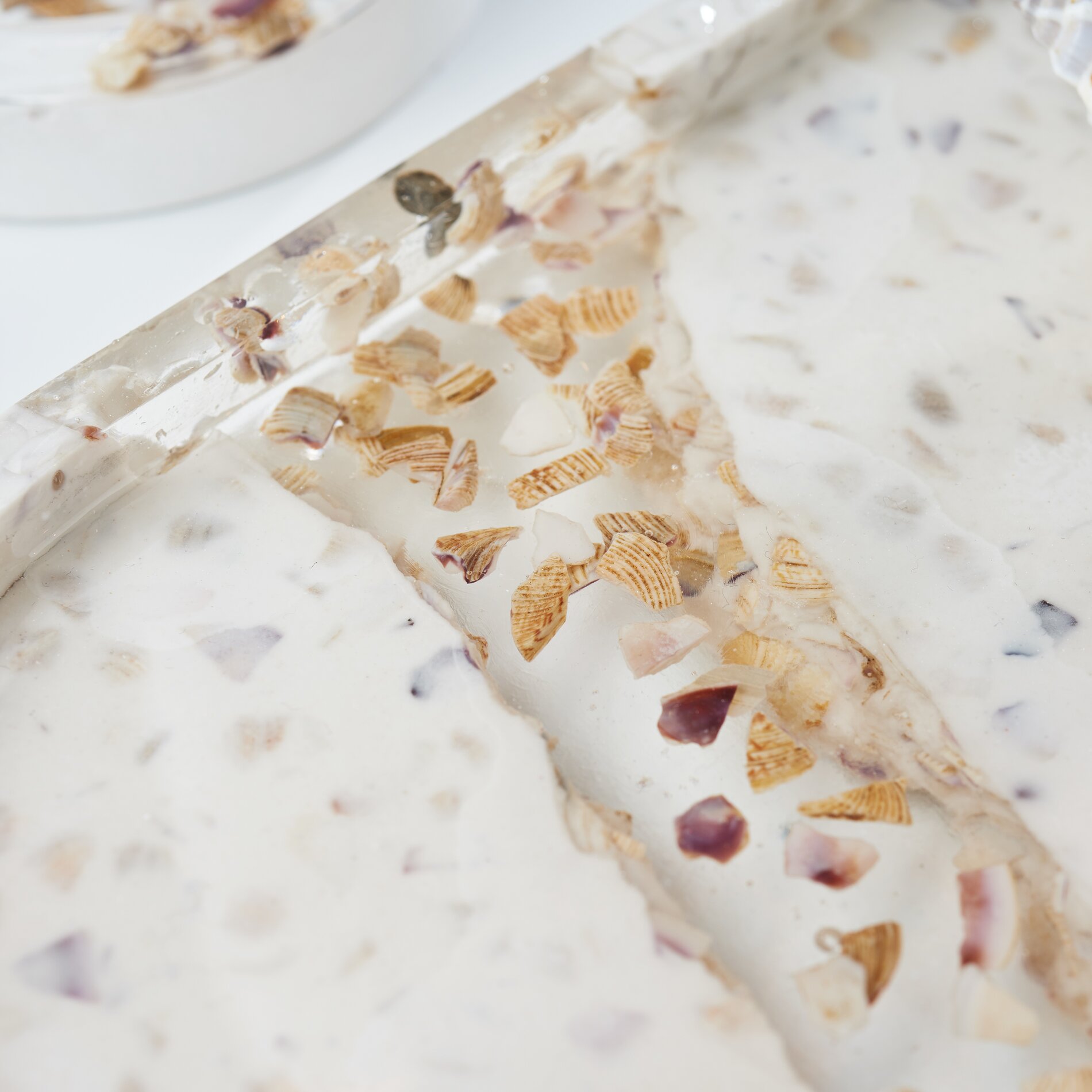 Mix approx. 5 tablespoons of Raysin with water to form a creamy mixture. Then add the shell granules and stir vigorously. Pour the mixture into the silicone mould and tap it lightly on the surface so that the air bubbles rise. After approx. 30 minutes, you can remove the coaster from the mold. Tap it on the edge of the table to break it. Then put the individual parts back into the mold. Then mix some casting resin according to the instructions on the pack and pour it into the gaps in the mold so that the base is covered. Leave the casting resin to dry for 12 hours. Once dry, sprinkle some shell granules into the casting mold. Mix the casting resin again and fill the mold with it. After 24 hours Time to dry: you can remove the coaster from the mold. To seal the surface, mix some casting resin again and coat the surface with a brush. After another Time to dry: your coaster is ready.