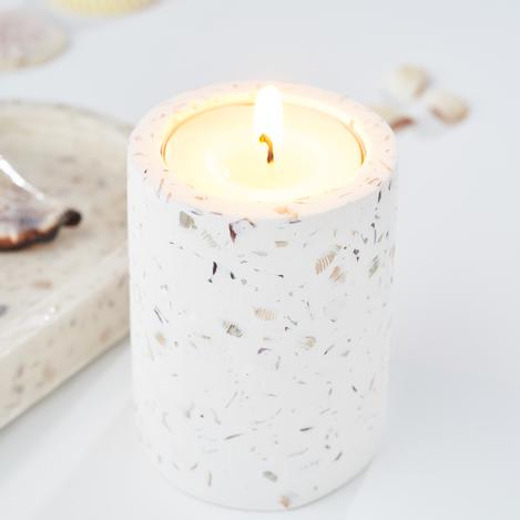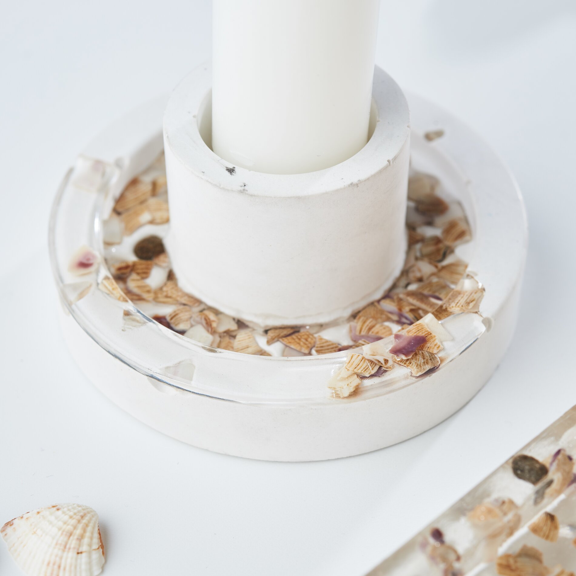 Mix approx. 4 tablespoons of Raysin with a little water to form a creamy mixture. Add some of the shell granules and stir again vigorously. Pour the mixture into the casting mold and leave it to dry for approx. 1 hour . Then carefully remove the casting from the mold. Moisten the sandpaper and sand the stick candle holder until the shell granules are clearly visible.