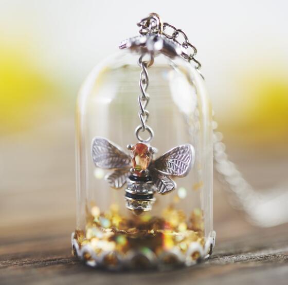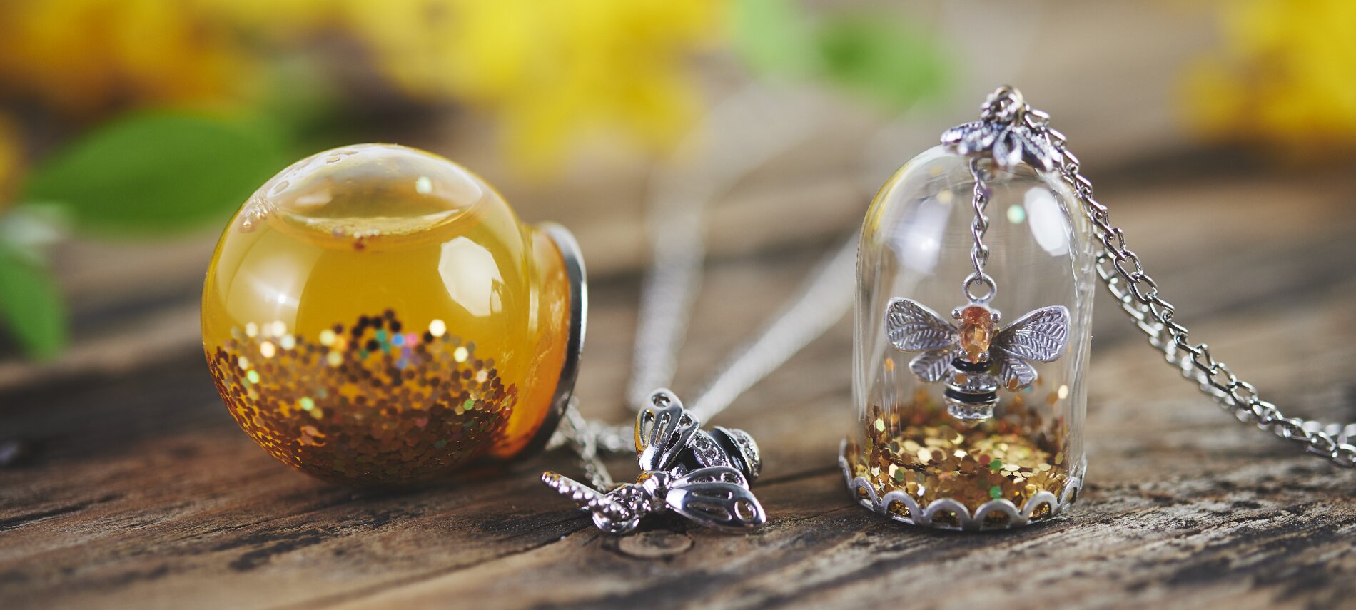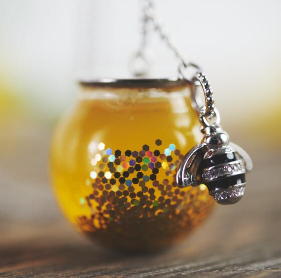 Using pliers, first remove 5 chain links from an anchor chain and attach them to the bottom of the bee pendant Tip: To be able to separate the chain links easily, it is best to use two pliers. Take one to hold on and the other to open the chain links. A chain pin is attached to the other end. At the top of the Glass bell there is a hole, there the chain pin is put through from below and decorated from above with a pearl cap. Cut off a large piece of the upper from end of the chain pin and leave about 1 cm of pin from standing. Bend the end of the chain pin to an eyelet which ends directly at the decorative cap. Spread some glitter on the bottom of the glass bell. Glue the bell to the bottom with gemstone glue