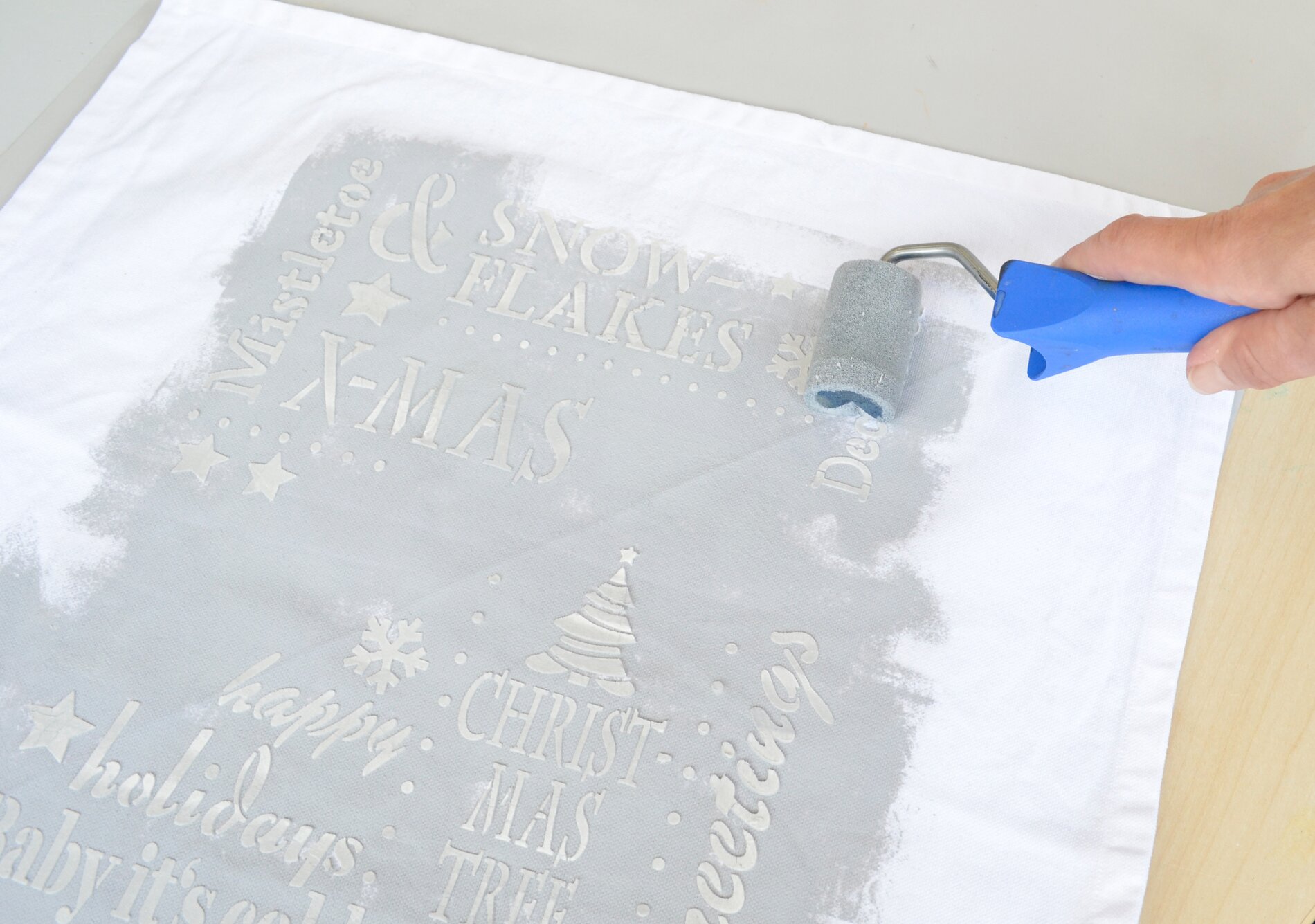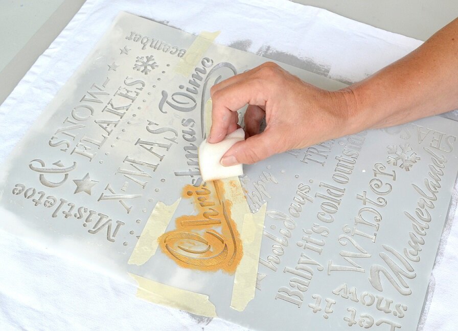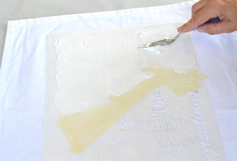 Allow the paint to dry thoroughly. Place Stencil on the cover again and, using a small sponge and the Inca Gold paint for textiles, dab on the lettering "Christmas Time". After the paint has dried, simply scratch off the colour blocker with a Spatula .