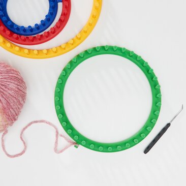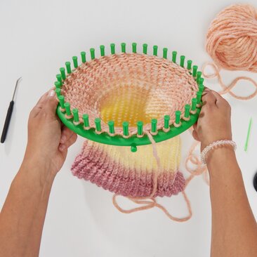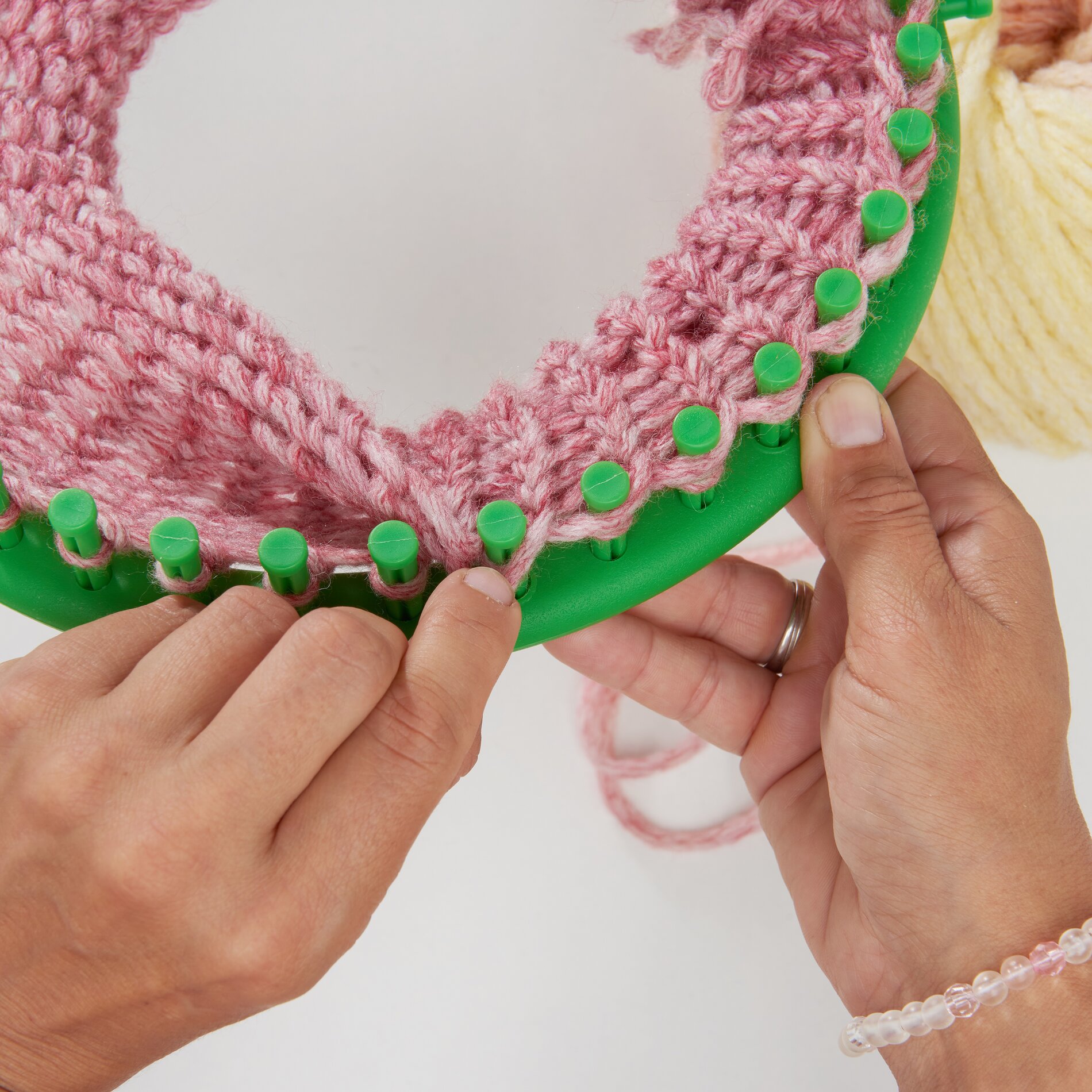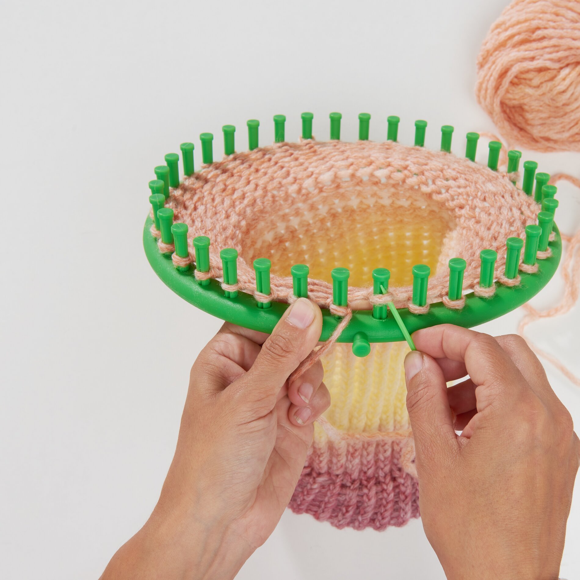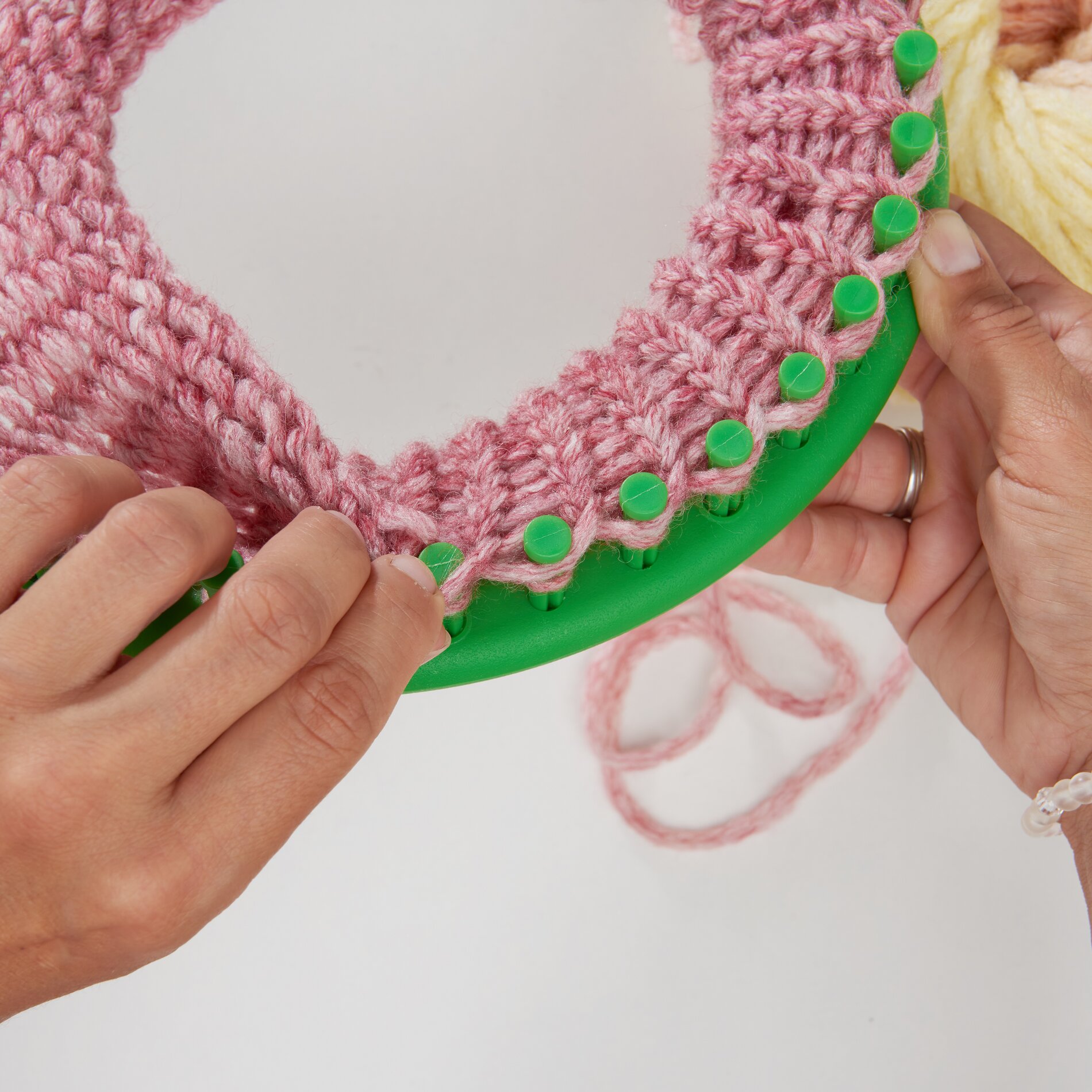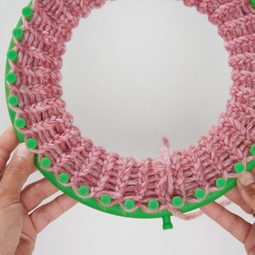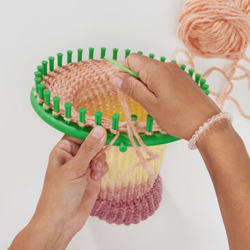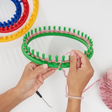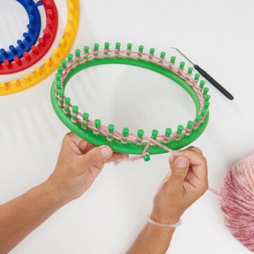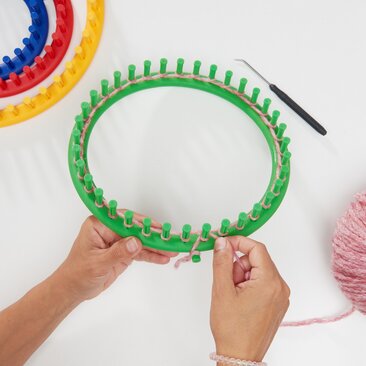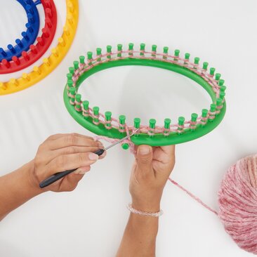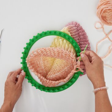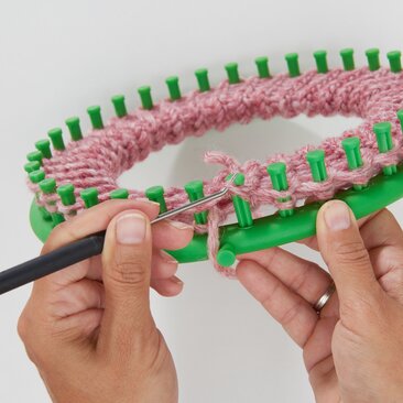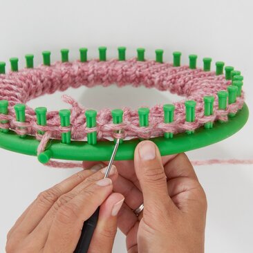 With a knitting ring you can knit in the round or in rows. You can therefore create flat knitted pieces or knitted tubes. Our instructions work for both types of knitting. For flat knitting, you also set a start and end pin depending on the desired width of your knitted piece and knit the individual rows between these two pins.