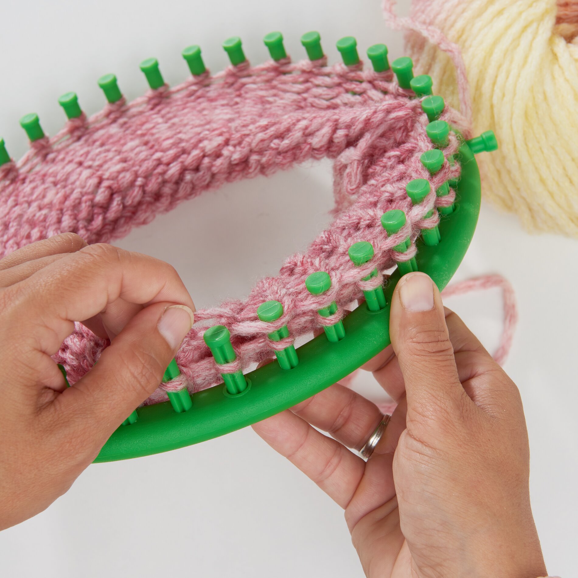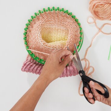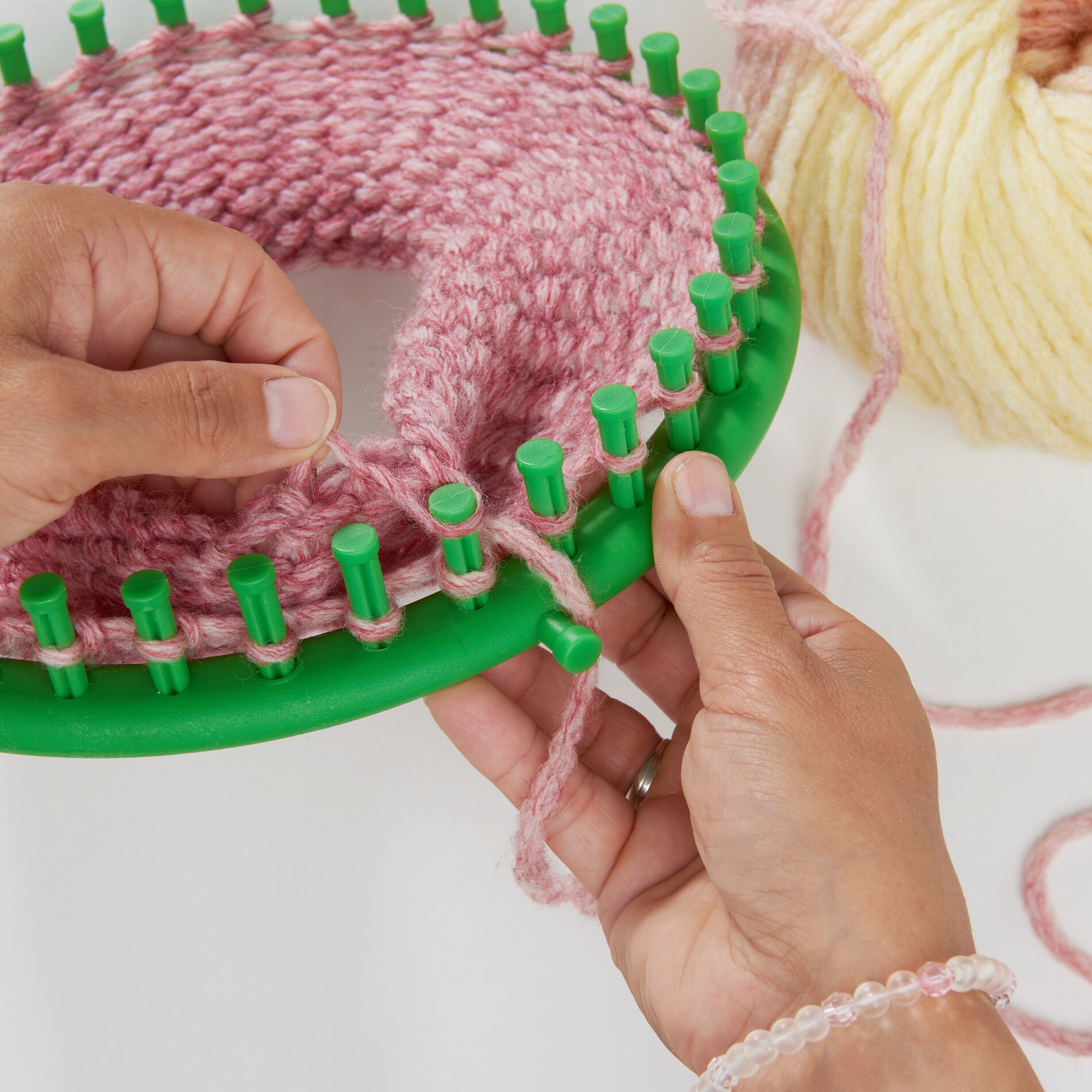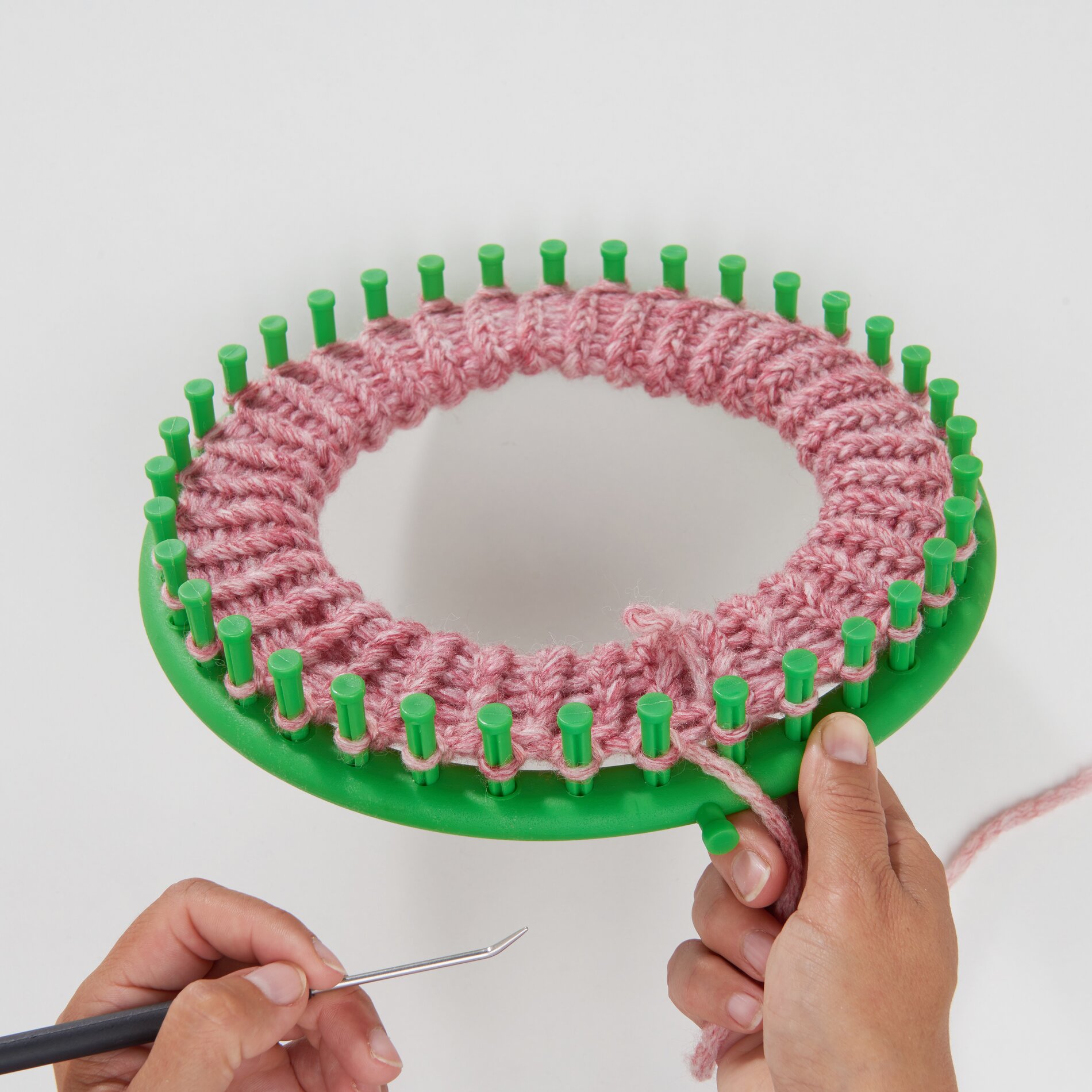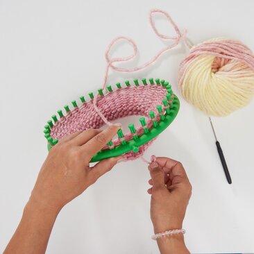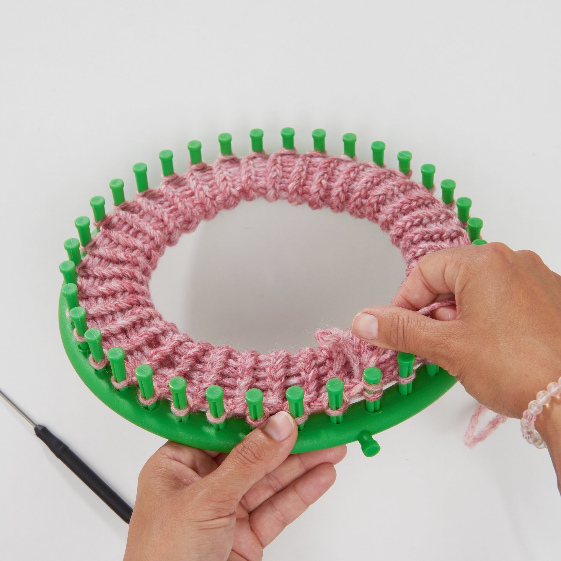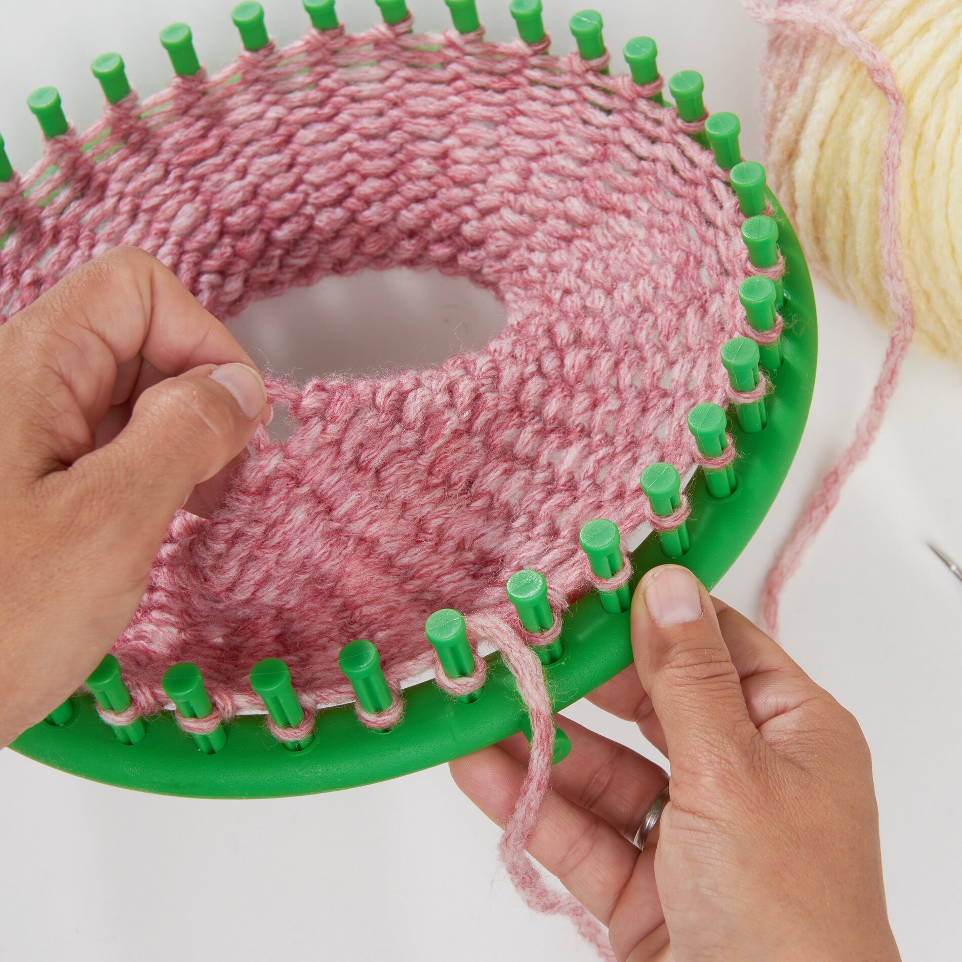 With a knitting ring you can knit in the round or in rows. You can therefore create flat knitted pieces or knitted tubes. Our instructions work for both types of knitting. For flat knitting, you also set a start and end pin depending on the desired width of your knitted piece and knit the individual rows between these two pins.
