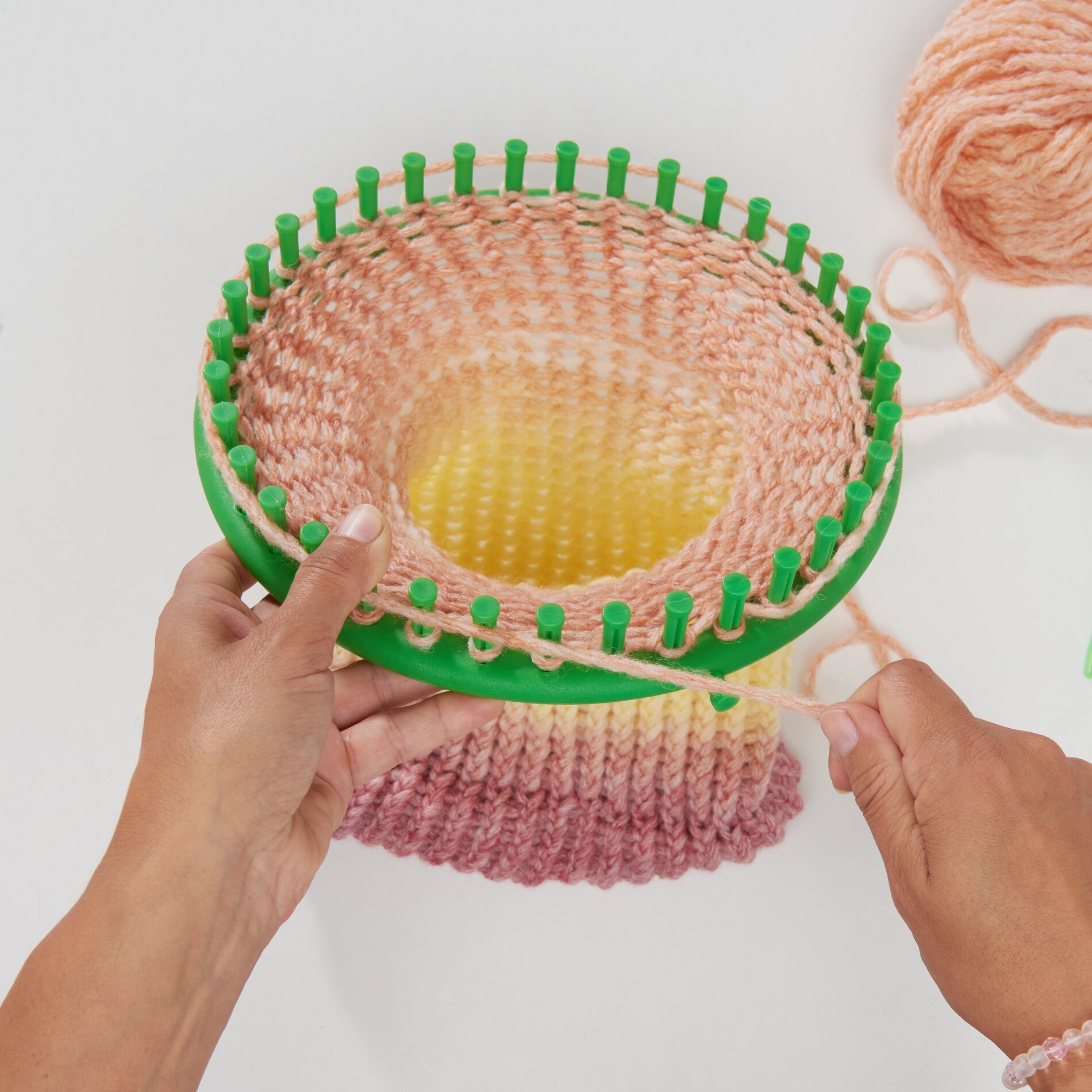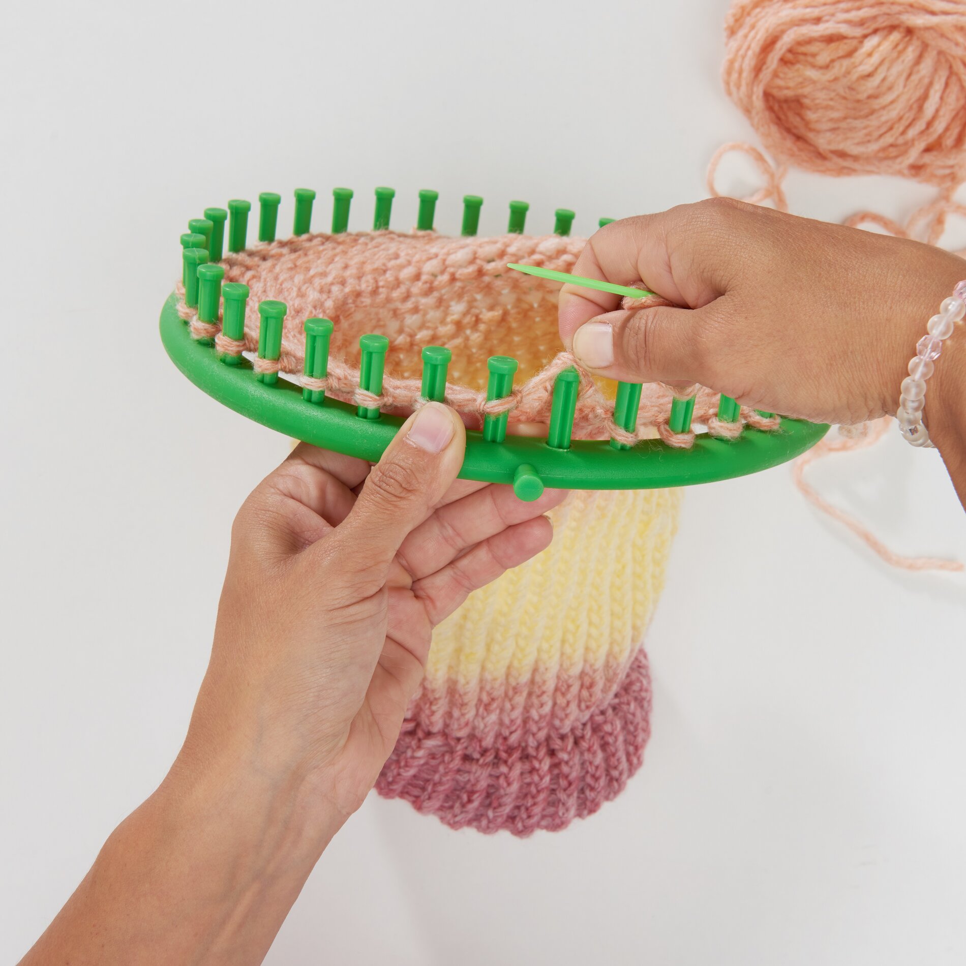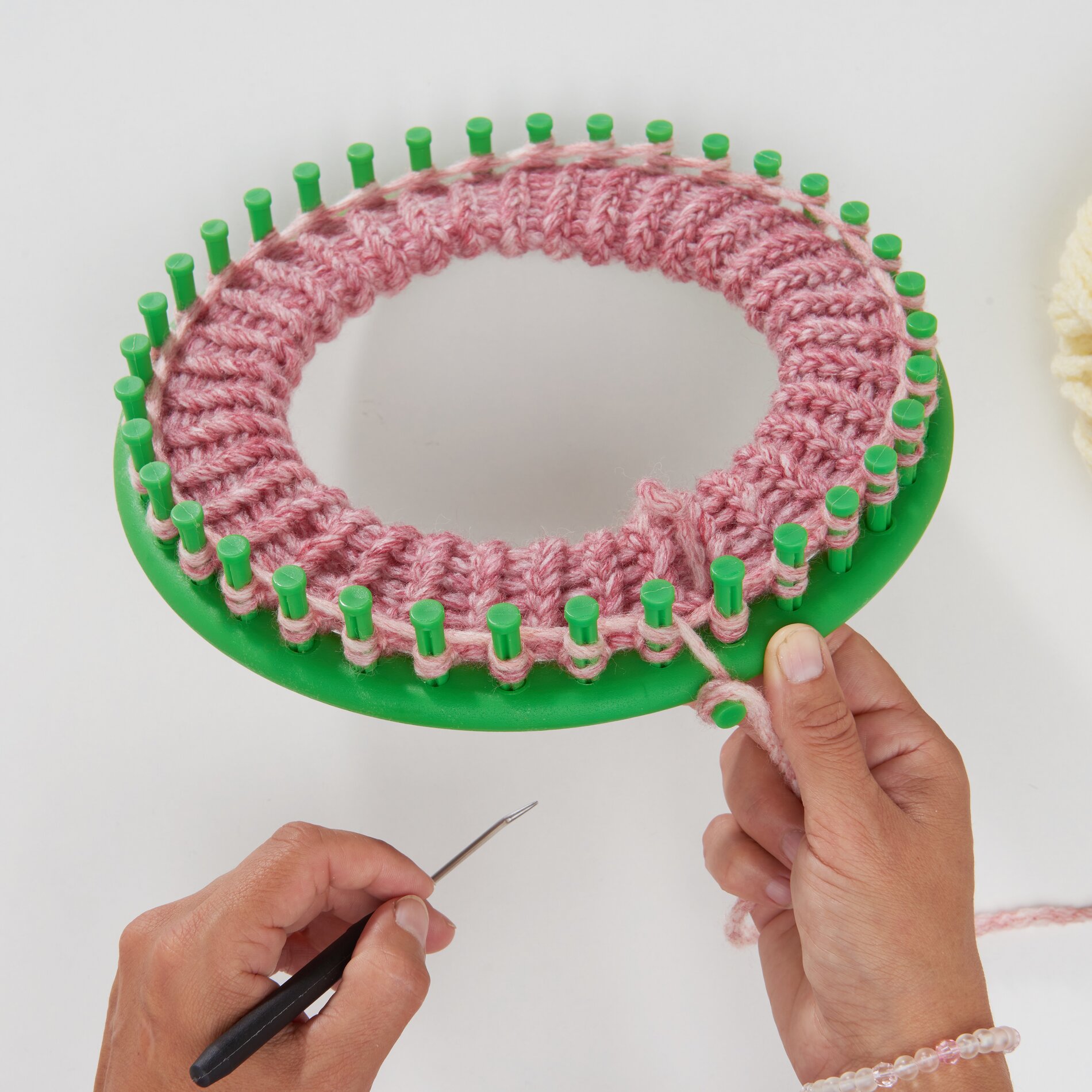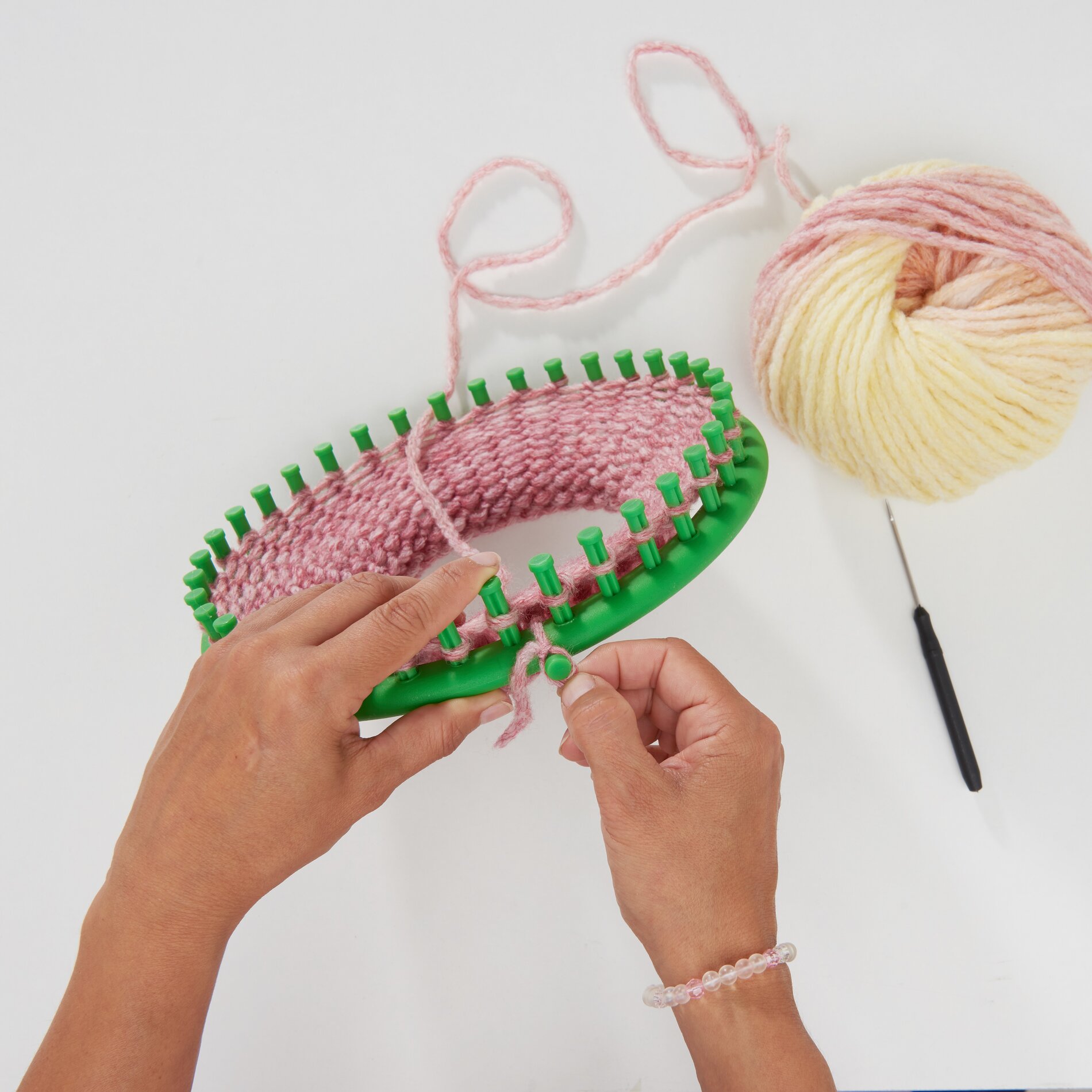 With a knitting ring you can knit in the round or in rows. You can therefore create flat knitted pieces or knitted tubes. Our instructions work for both types of knitting. For flat knitting, you also set a start and end pin depending on the desired width of your knitted piece and knit the individual rows between these two pins.