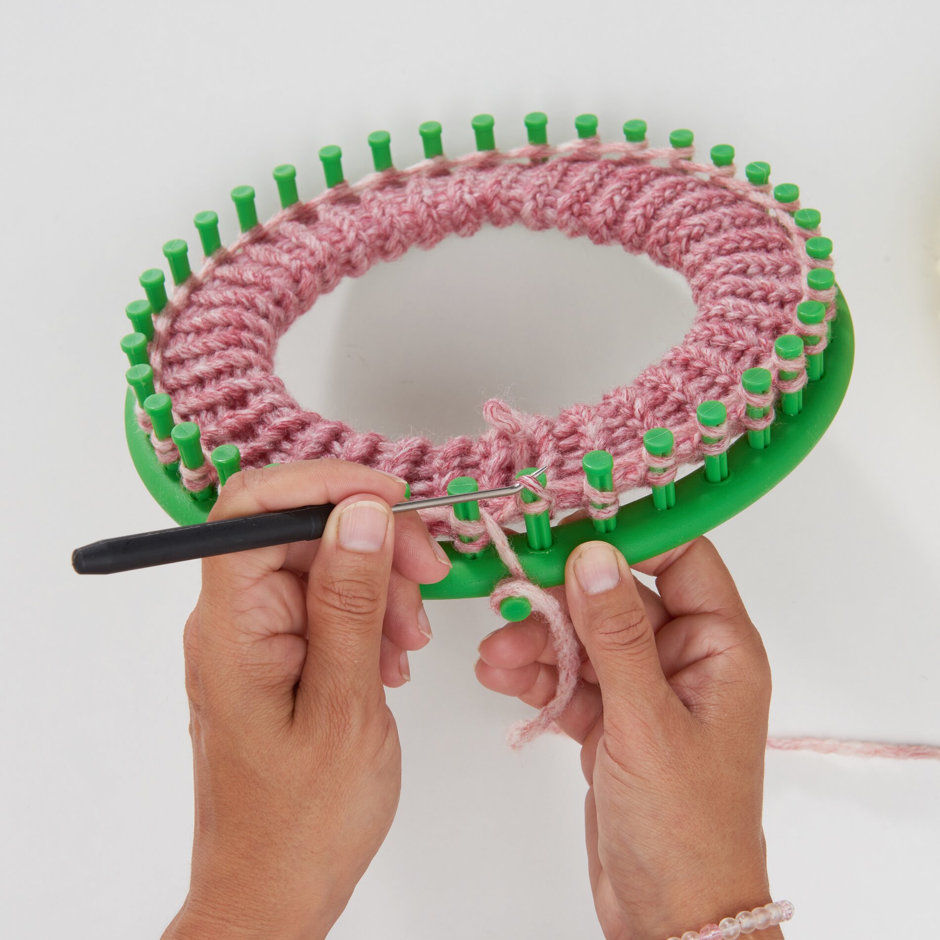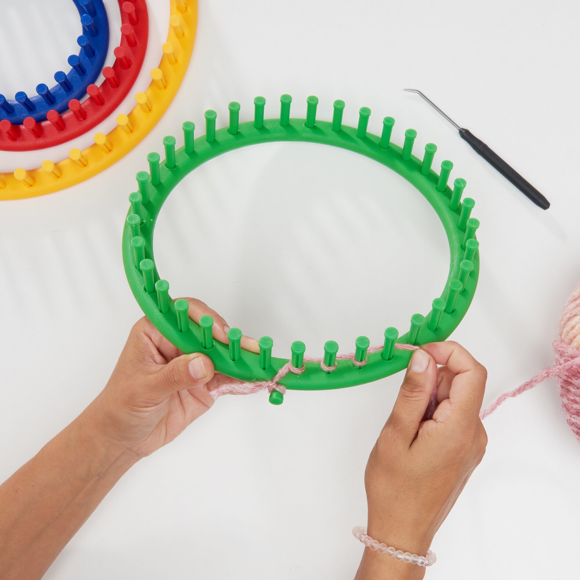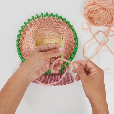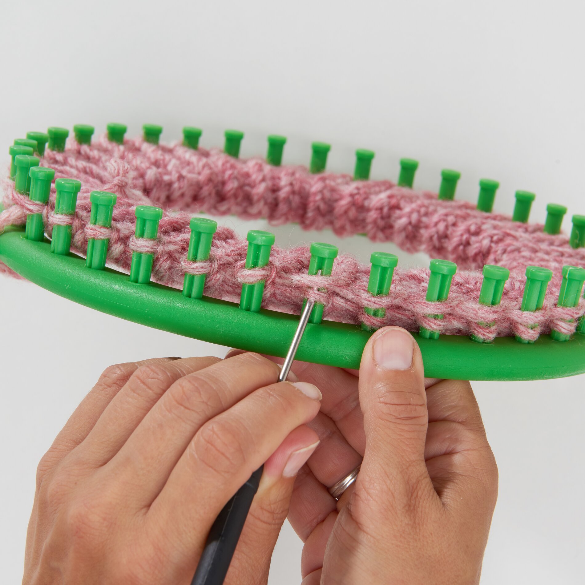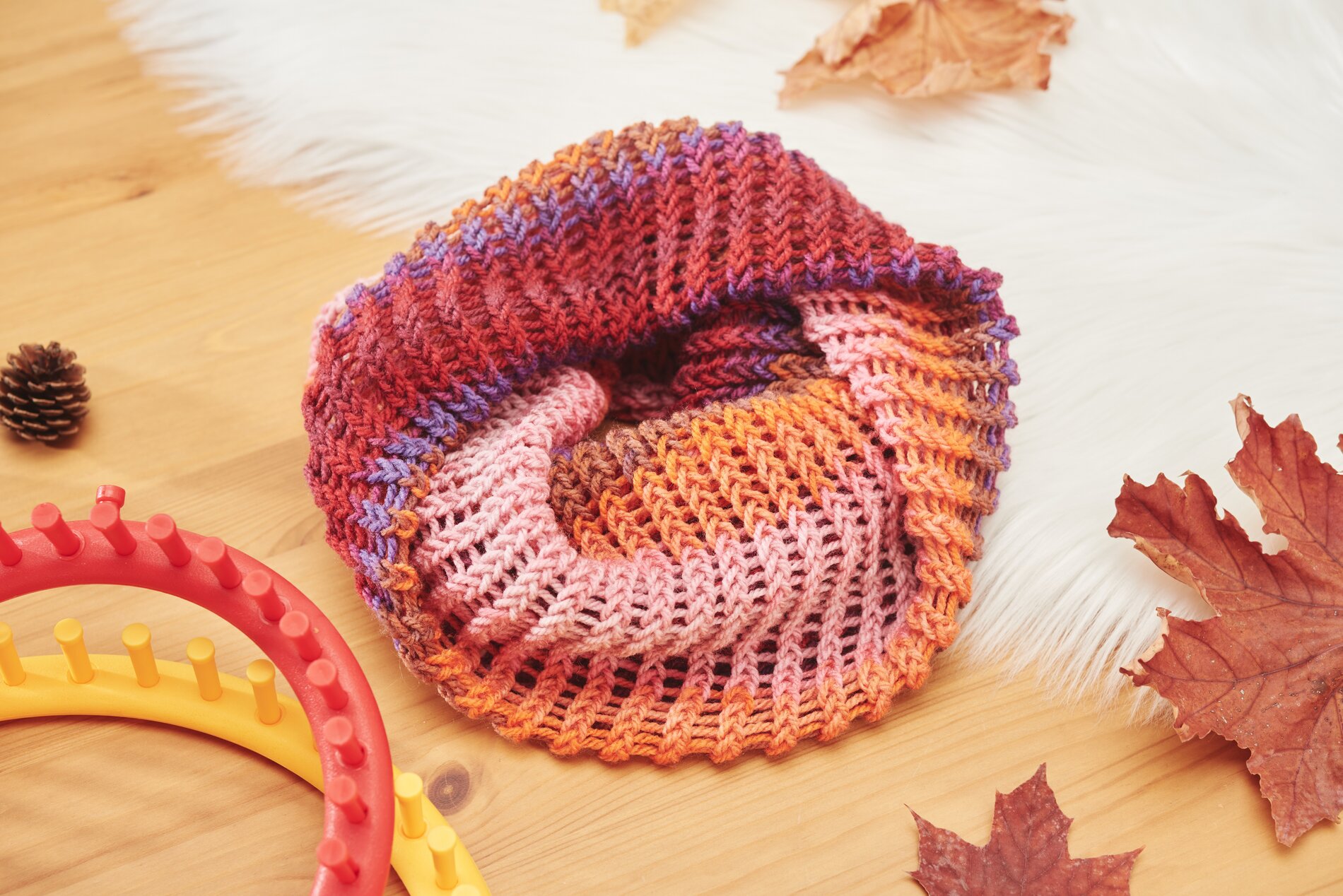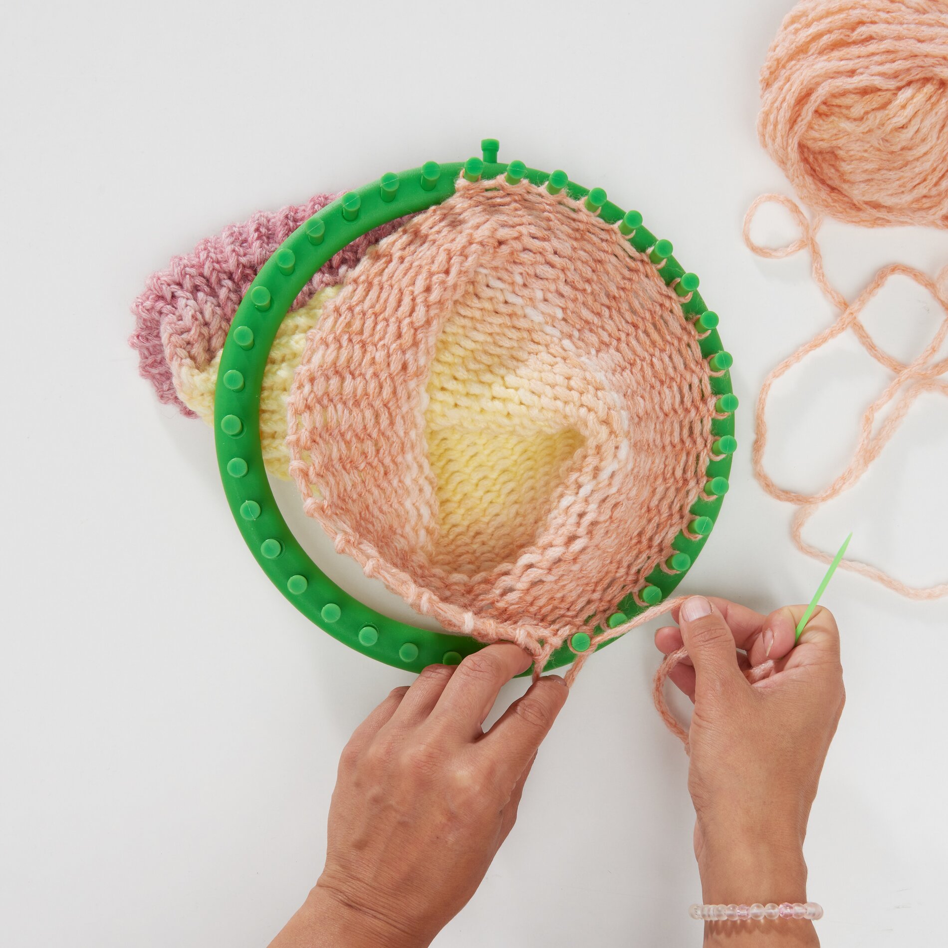 With a knitting ring you can knit in the round or in rows. You can therefore create flat knitted pieces or knitted tubes. Our instructions work for both types of knitting. For flat knitting, you also set a start and end pin depending on the desired width of your knitted piece and knit the individual rows between these two pins.