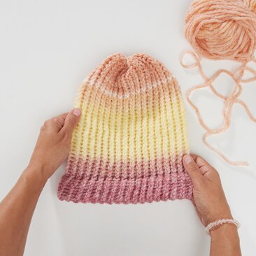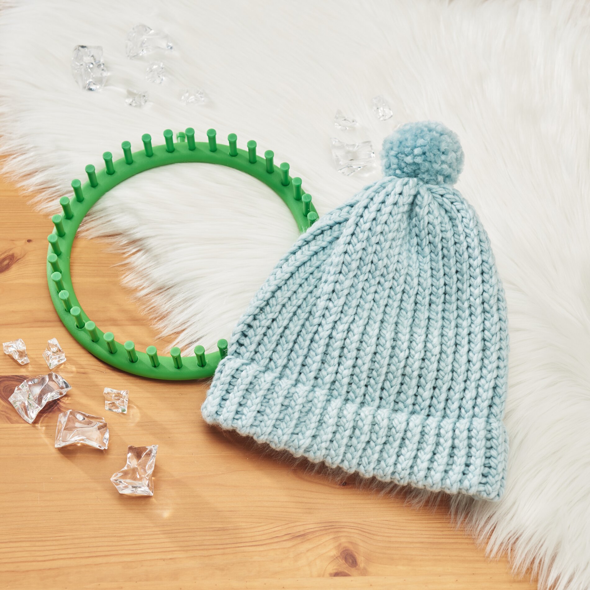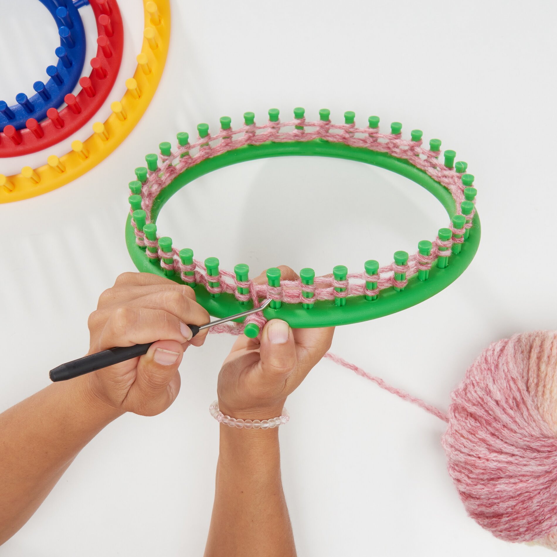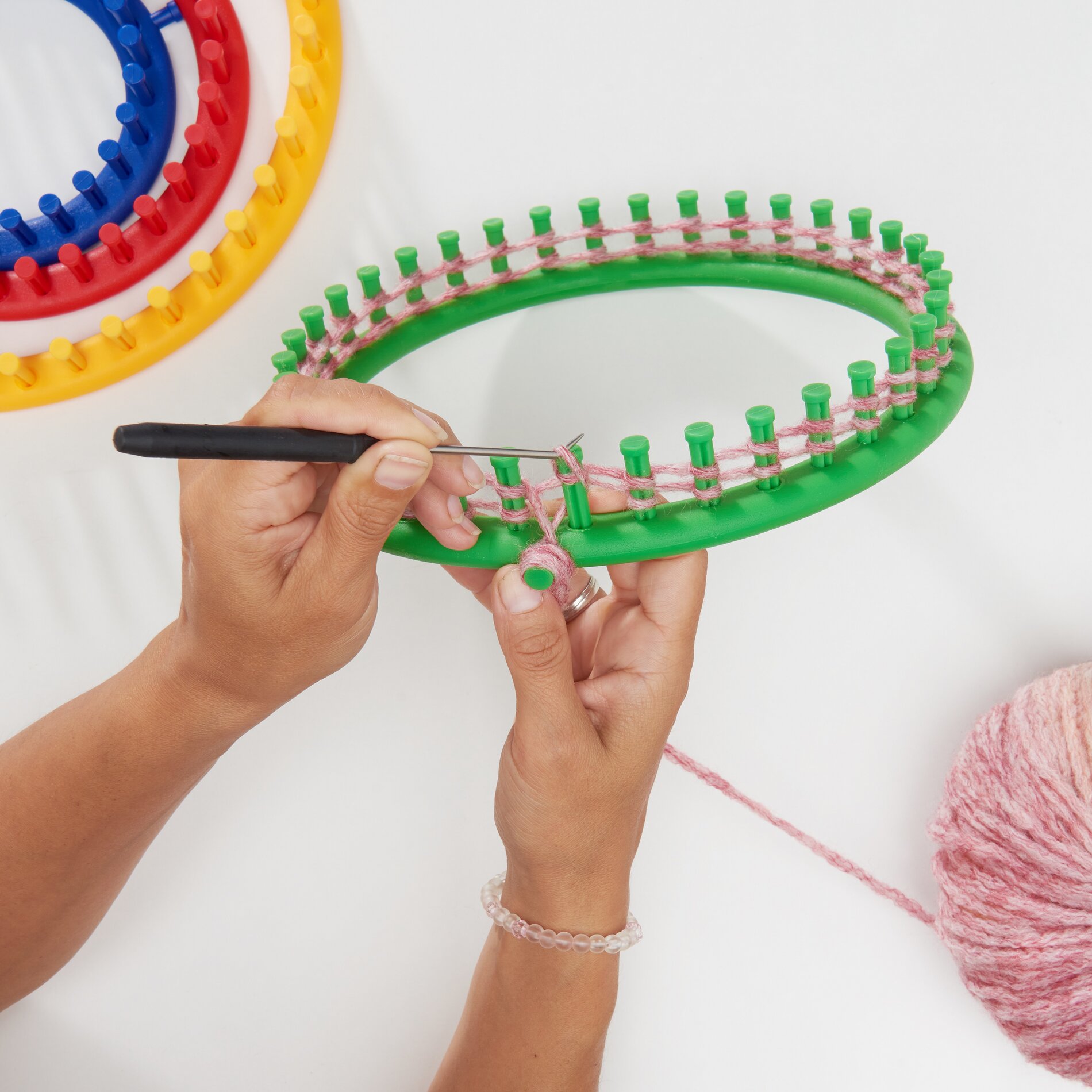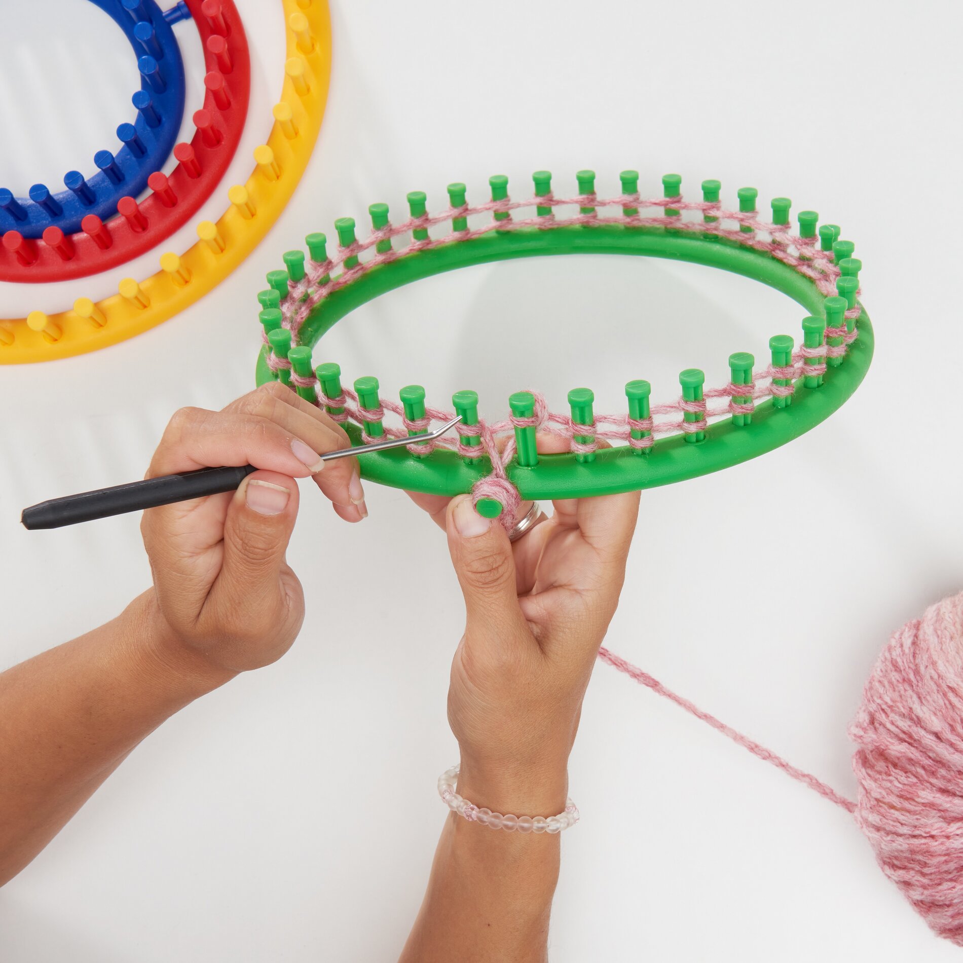 With a knitting ring you can knit in the round or in rows. You can therefore create flat knitted pieces or knitted tubes. Our instructions work for both types of knitting. For flat knitting, you also set a start and end pin depending on the desired width of your knitted piece and knit the individual rows between these two pins.