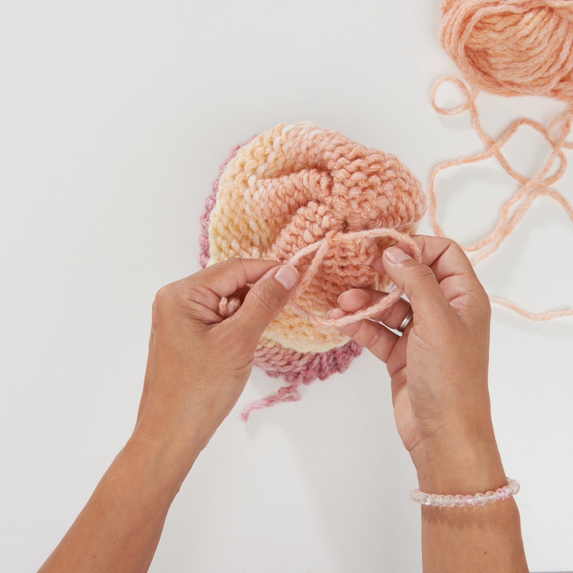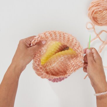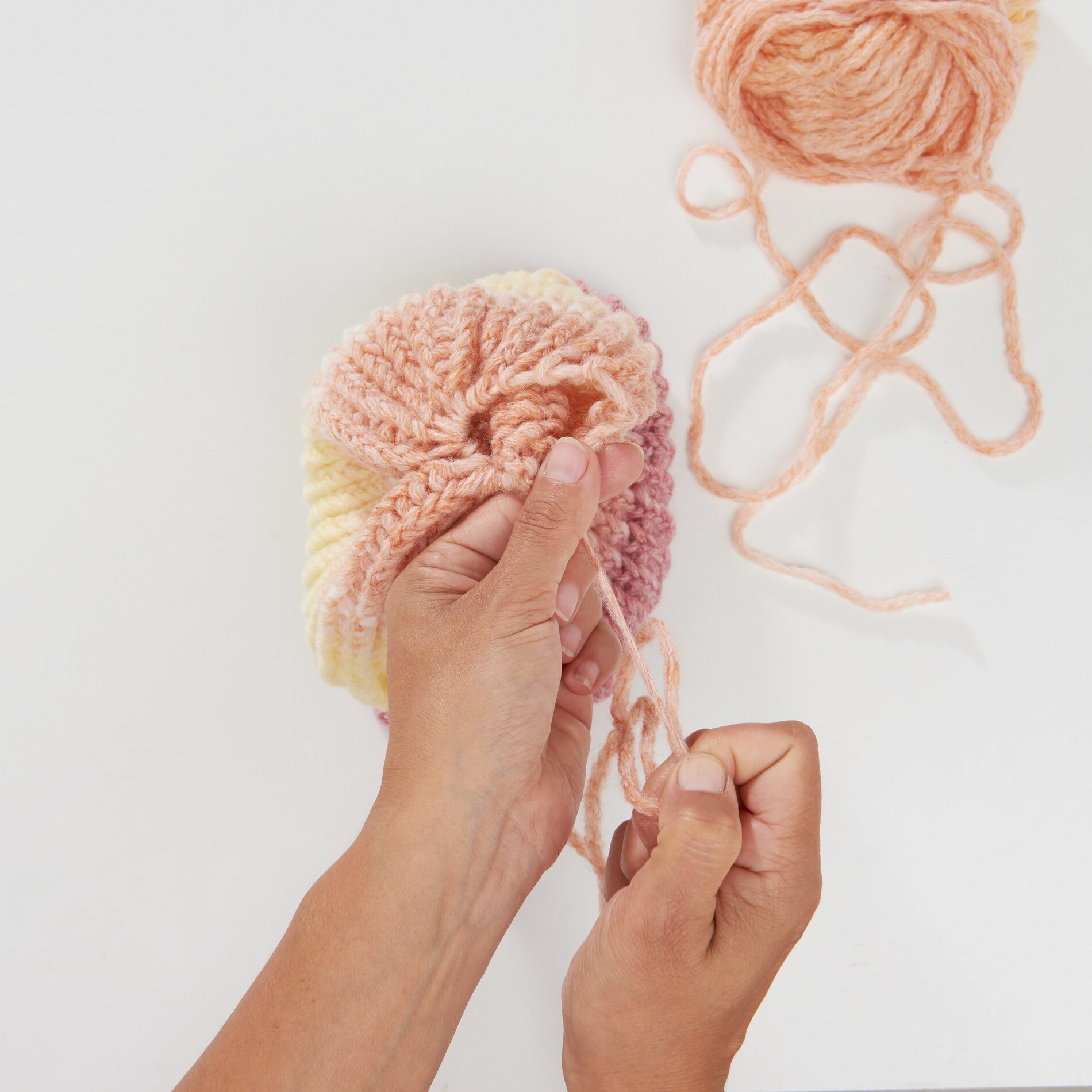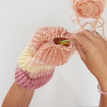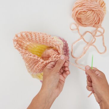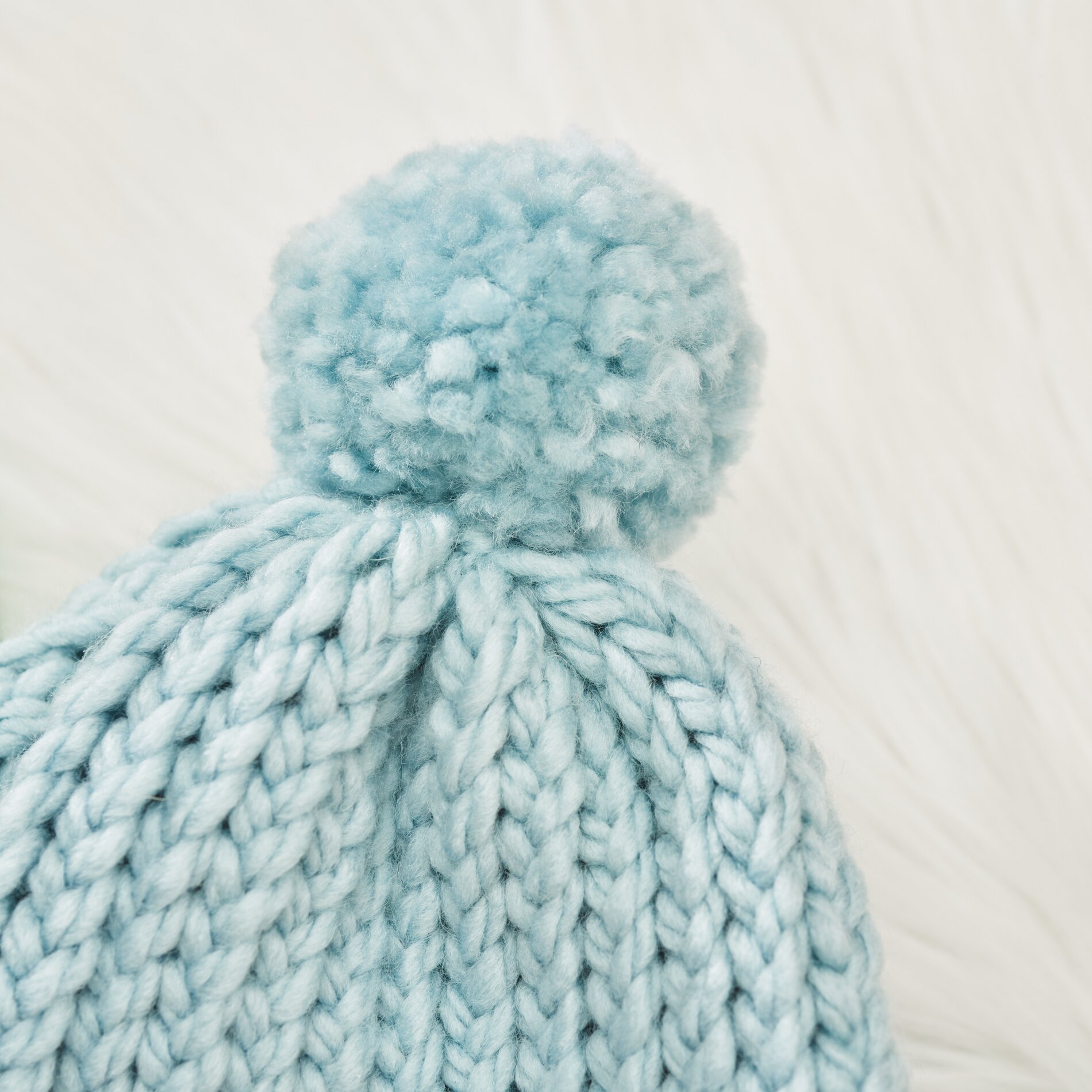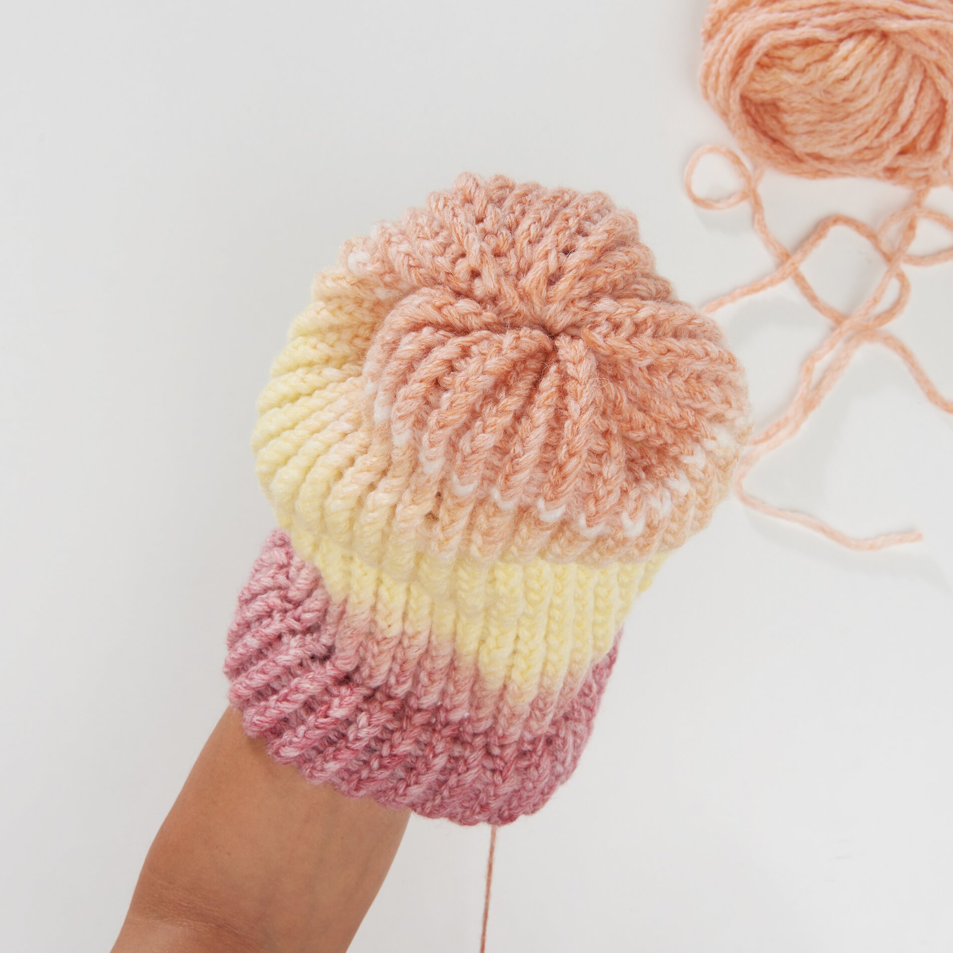 7. Finally, sew the pompom on by hand using the needle from the knitting rings set.