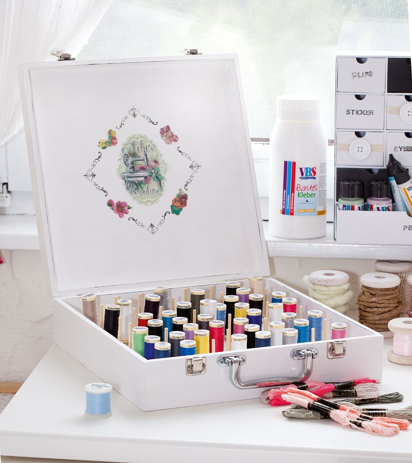This case is indispensable for every handwork fan. You cannot arrange your yarn reels more clearly! The robust wood of the case also offers you many surfaces to design it individually. With a little colour and a Motif straw silk you can create a charming picture inside the lid.