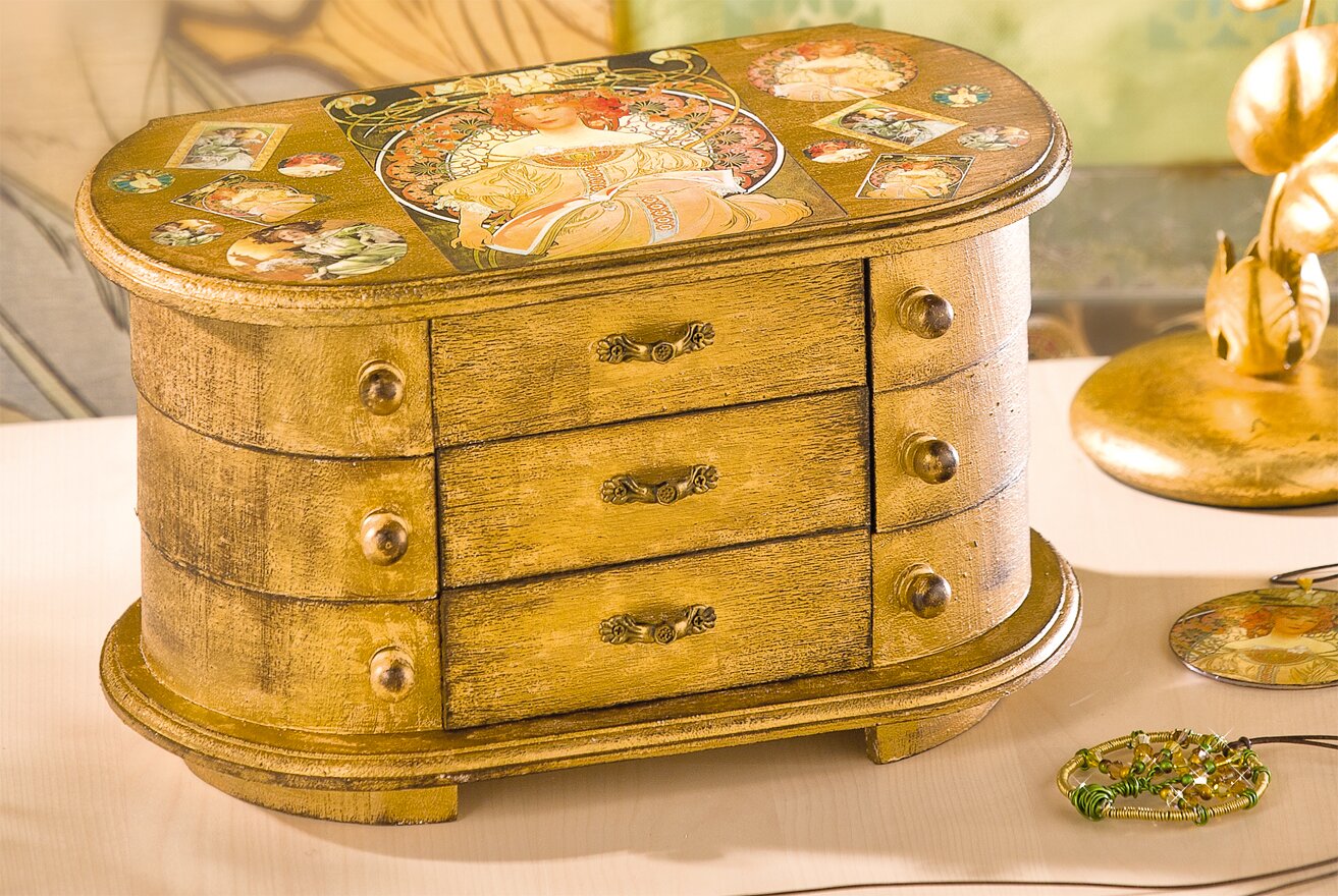 In the compartments of this cabinet you have plenty of room for your favourite pieces of jewellery. The lid is decorated with different decoupage motifs, the rest of the body gets a very high quality look due to the antique gold colour. Both techniques complement each other perfectly.