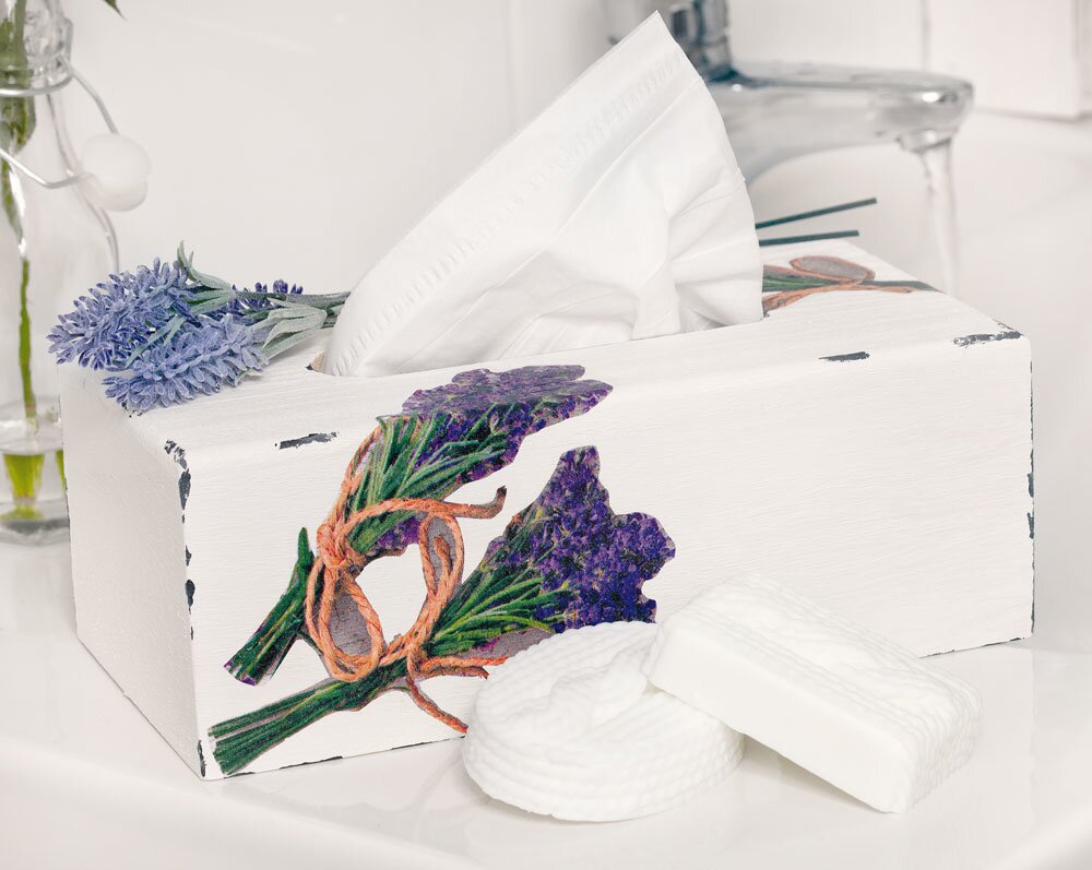 Prime the box in white and let it dry. Cut out the Napkins-motifs and stick them onto the box with the Napkin varnish When the paint is dry, accentuate the edges by drawing with the brush along the edges with the dark paint.