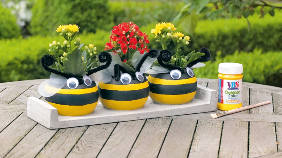 Prime the planters with the Outdoor-Color paint in yellow and let them dry. Then paint the typical bee rings around the plant pots with the black colour.