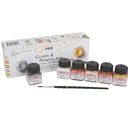 The KREUL "Glass & Porcelain Classic - Metallic Colours" Set consists of seven parts and includes a brush in size 4 and the colours whiteMetallic-Nacre, Metallic-Champagne, Metallic-Copper, Metallic-Gold Bronze,Metallic-Silver and Metallic-Gold. The jars have a capacity of approx. 20 ml each.
