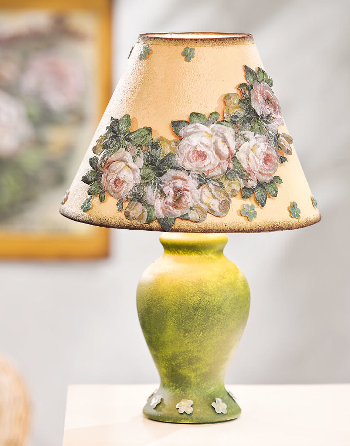 You can design the lamp base with a colour mixture of Ivory, sap green and olive green. Then dampen this primer with some dark oxide green.
