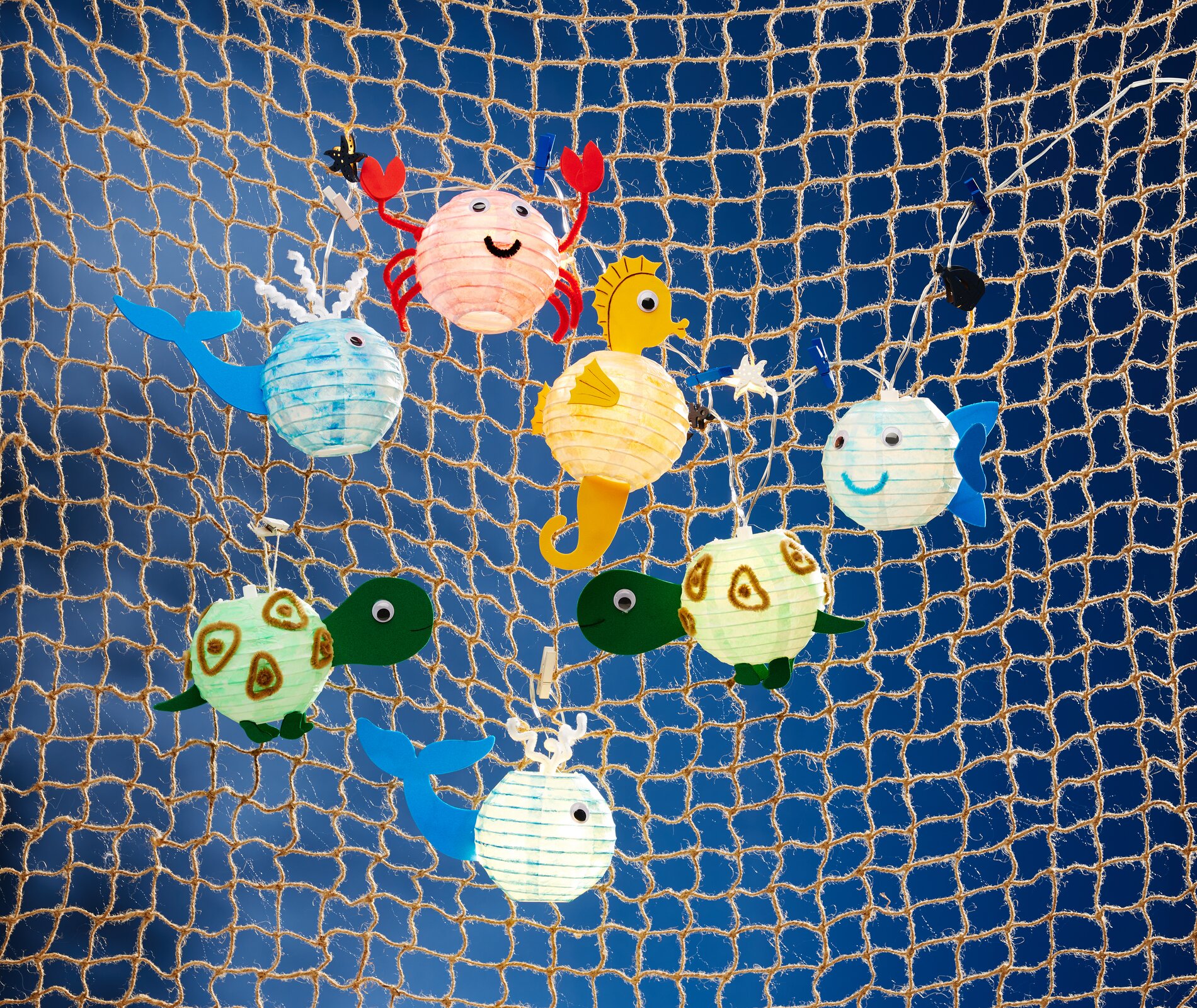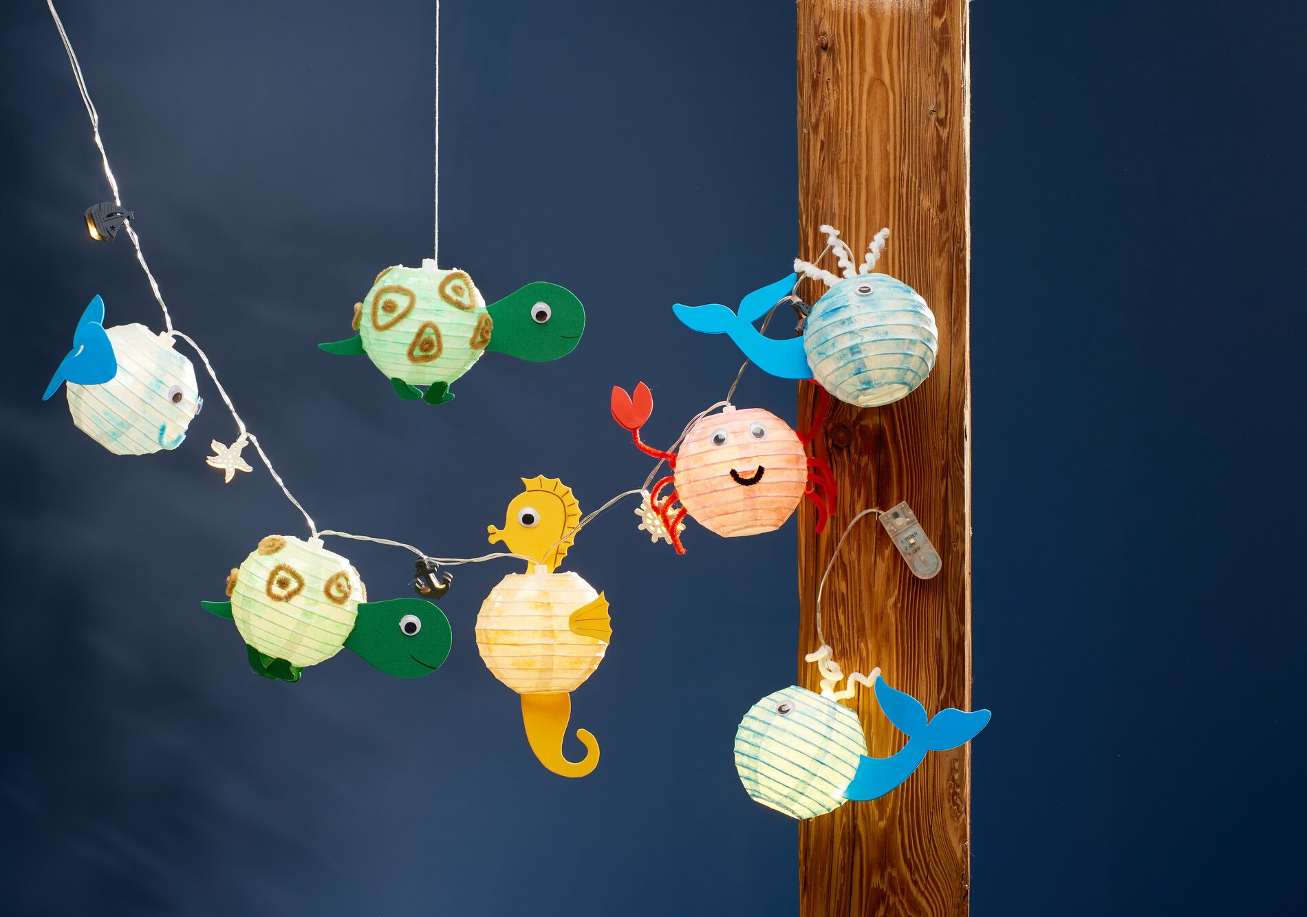 Now press every second little light of the light chain from above into the plastic holder of the lantern. To the remaining lights, which hang between the sea creatures, fix a suitable scatter piece in each case.