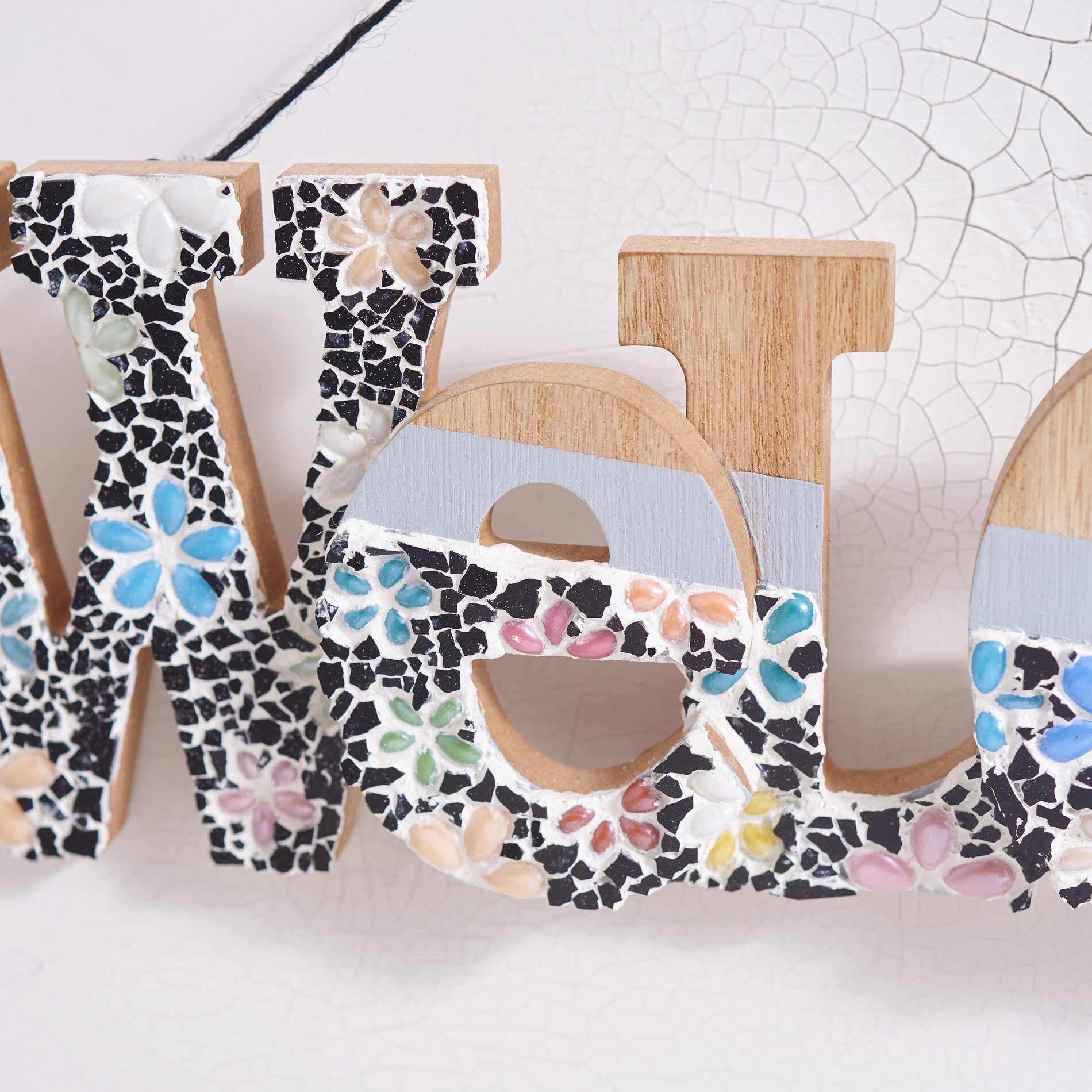 Once dry, glue the glass mosaic stones in the shape of flowers onto the letters. You can then glue the crackle mosaic around the flowers as desired. You can use our example image as a guide here.