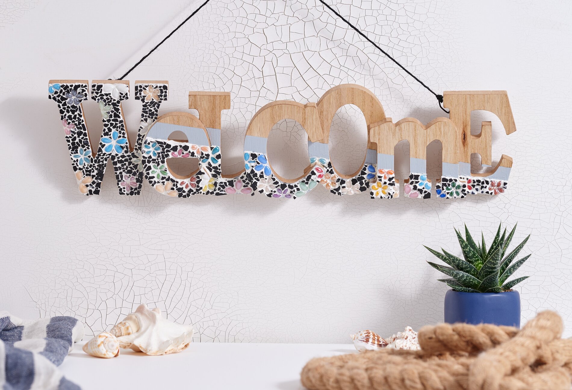 Once the joint filler has dried, the tiles must be wiped or polished with a dry cloth. Finally, the entire surface should be sprayed with permanent spray to protect it. This must be allowed to dry sufficiently and completely ribbon finally, a string is tied to the hangers on the back of the lettering.