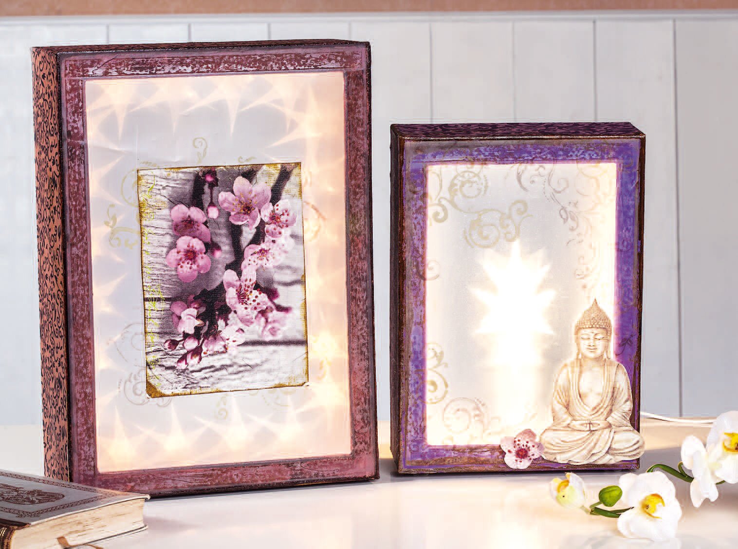 With the Ink Pads optionally stamp on squiggles and wipe sharply over the edges. Glue the fairy lights clips on the back of the frame as desired and insert the fairy lights or make a cut-out for the connection cable set on the back. Fix the lamp socket and light chain with hot-melt adhesive