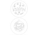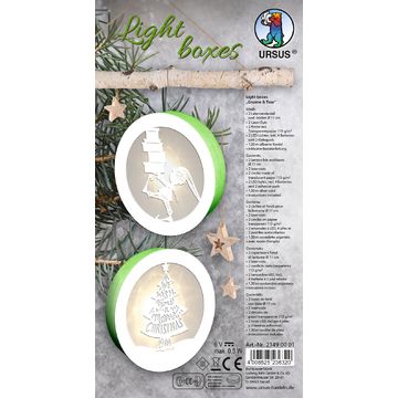 Christmas lightboxes "Merry Christmas", set of 2. The set contains two boxes with a diameter of approx. 11 cm and the materials for making the boxes. A handicraft instruction is included in the set. The patterns show a city with the text "Let it snow" and the lettering "Merry Christmas", surrounded by elex branches.