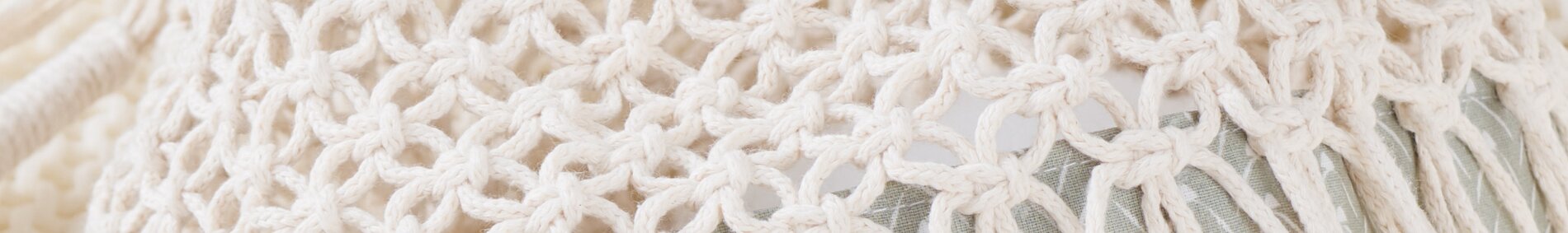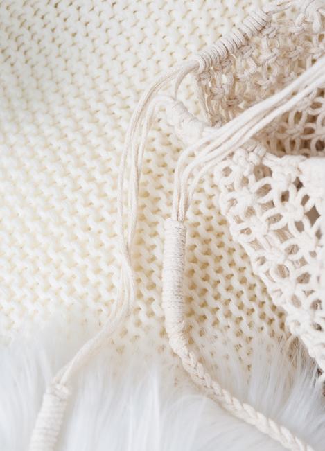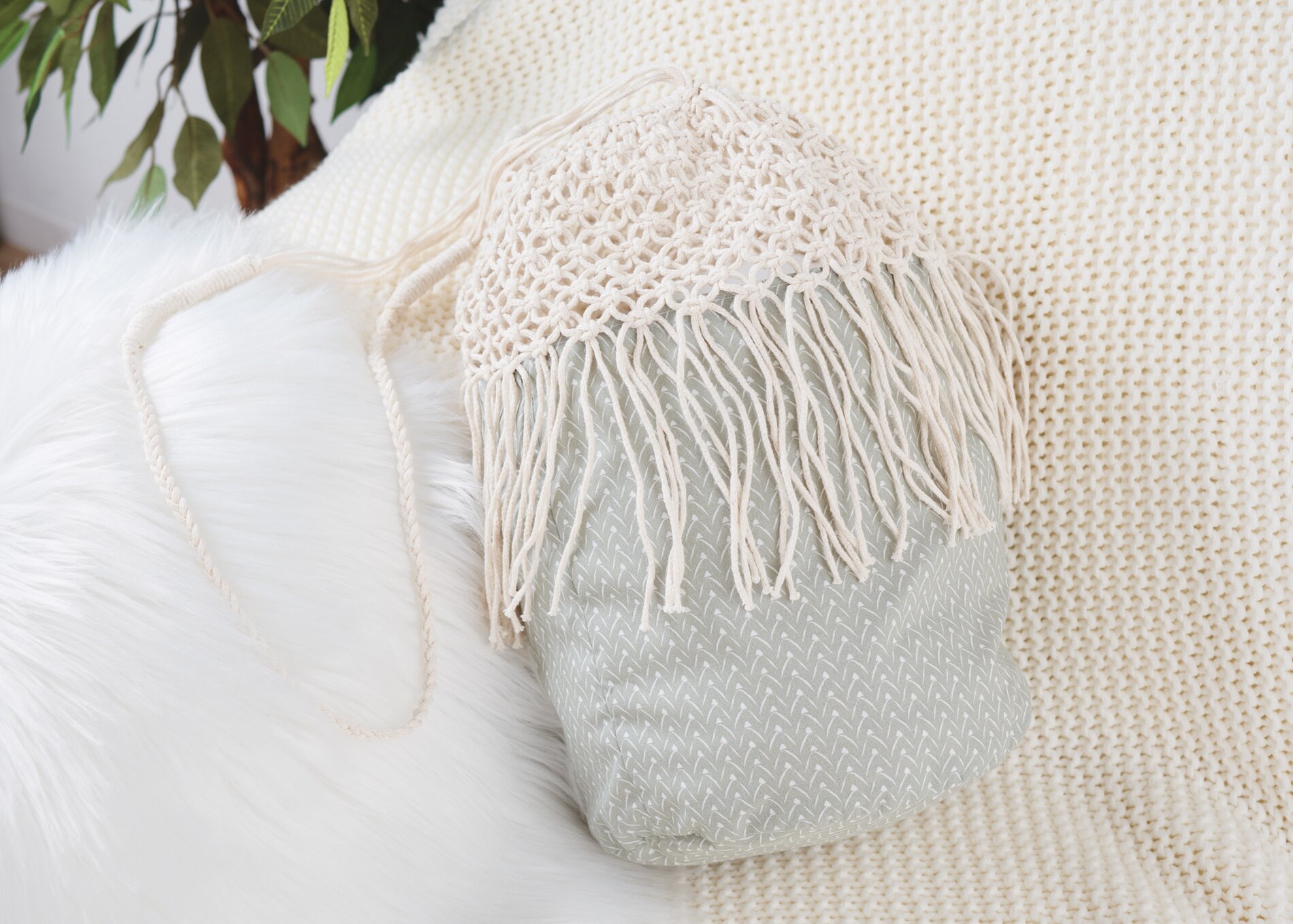 Now tie 10 rows with the square knot for the pretty macramé area. The distance between the knots here is about 1 cm. Both parts, fabric and macramé are now connected. Glue the last knots to the fabric with craft glue. Glue 28 knots in the front and 28 knots in the back to the bag.