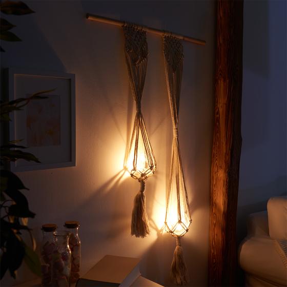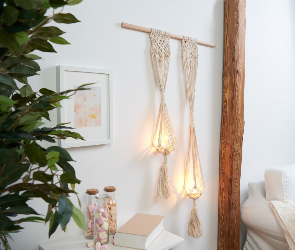 The knotted hanging light is a decorative highlight in any home. It is equipped with LED tea lights and is a great eye-catcher on the wall. But it also works great as a hanging room divider. You can get all the materials used for this idea in our online store.