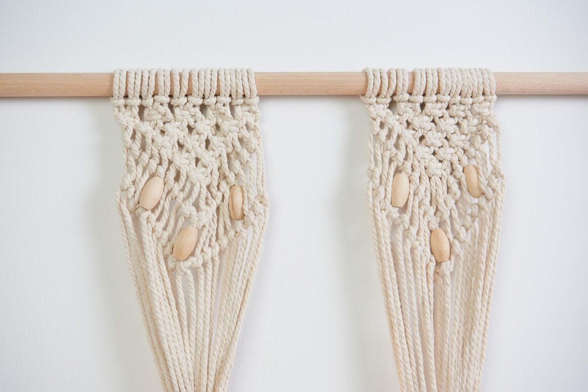 There are several macramé techniques used in this idea. All knots are explained in detail in our basic macramé tutorial. Download best the step-by-step photo instructions from here. Our description is for knotting one light strand at a time.