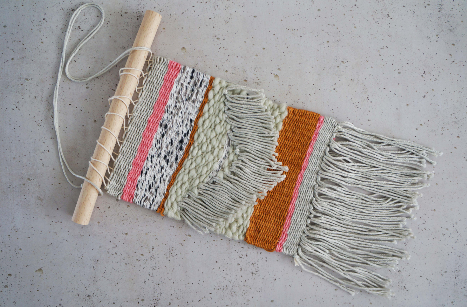 Sew all the wool threads to the back of the tapestry with a sewing needle. Then thread the loops over the wooden stick, knot a thread to the stick and hang up your piece of jewelry.