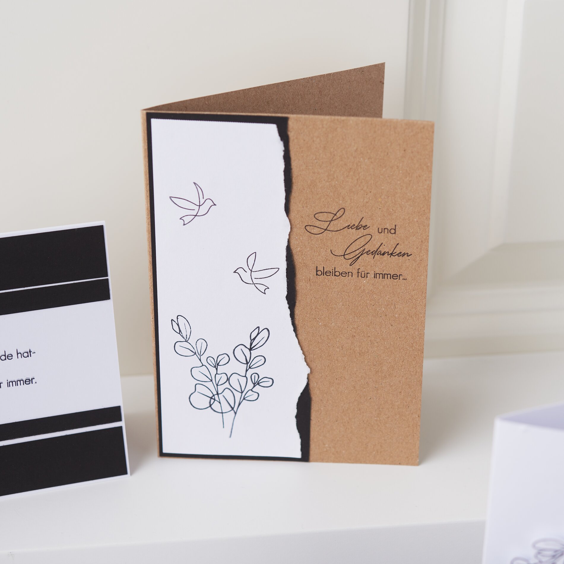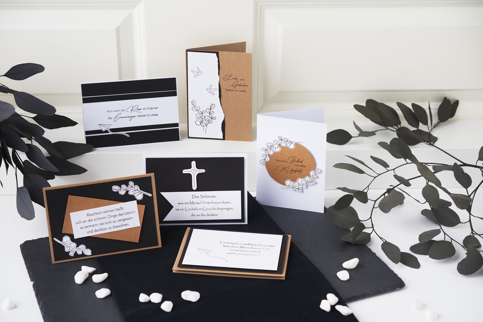Cut out the individual elements in suitable formats or shapes. Arrange them together with other paper cuttings on the cards to create decorative looks and stick everything onto the double cards.