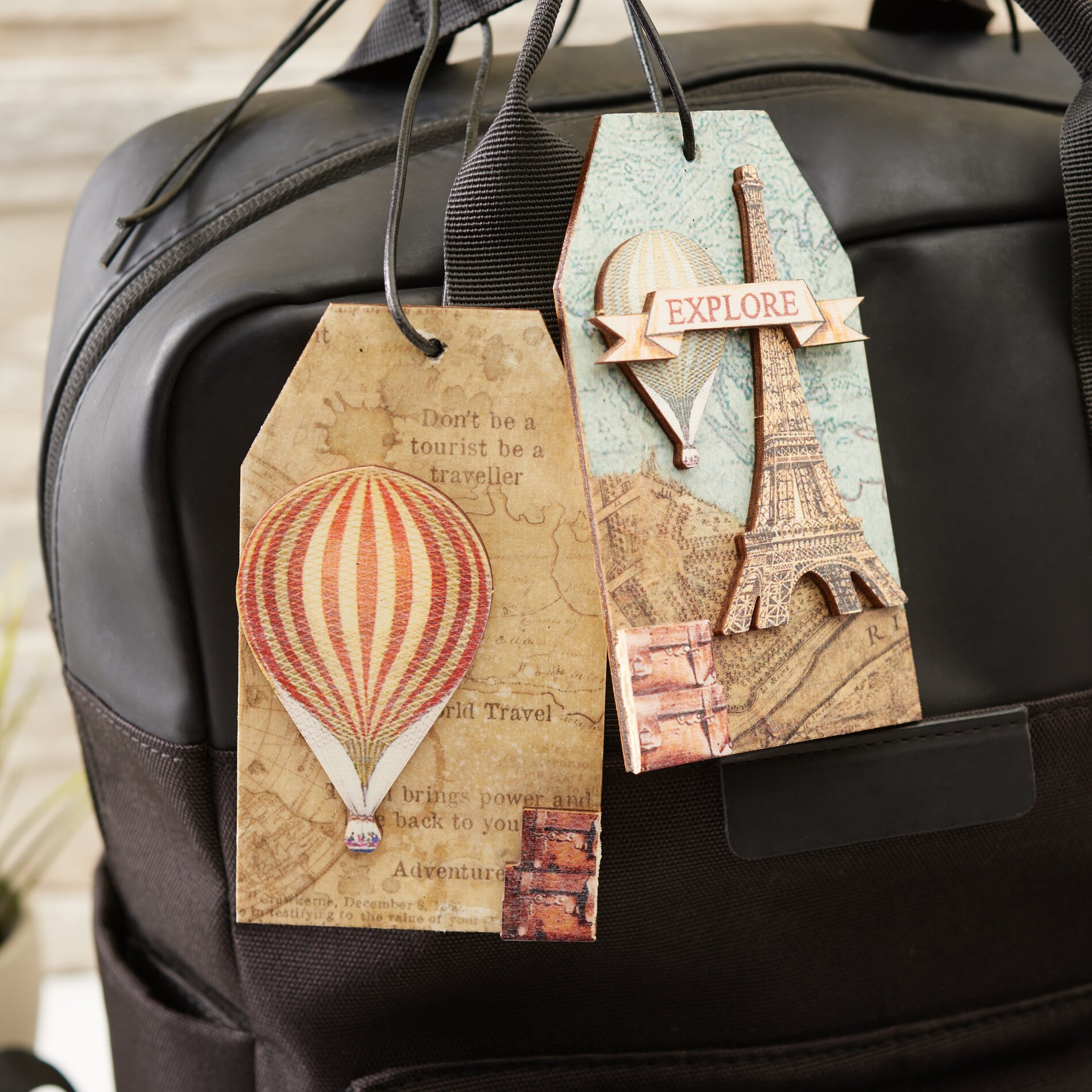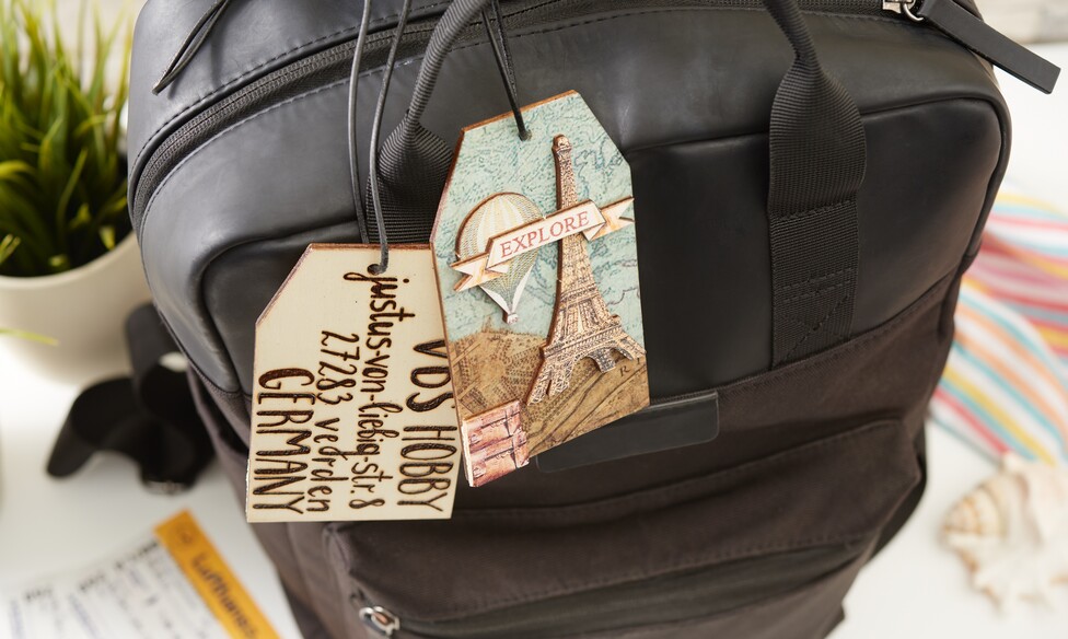 Once dry, cut off the excess straw silk paper from the edges of the tag. Then glue the laser-cut motifs onto the pendant VBS handicraft glue the Lasercut motifs onto the designed tag. In our example, we have attached the luggage tags to the bag with a leather strap.