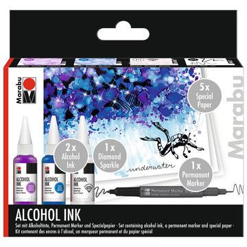 Marabu Alcohol Ink Set Neon with three colours Alcohol Ink, a permanent Marker and 5 x Special paper for the latest mixed media designs and artistic projects.