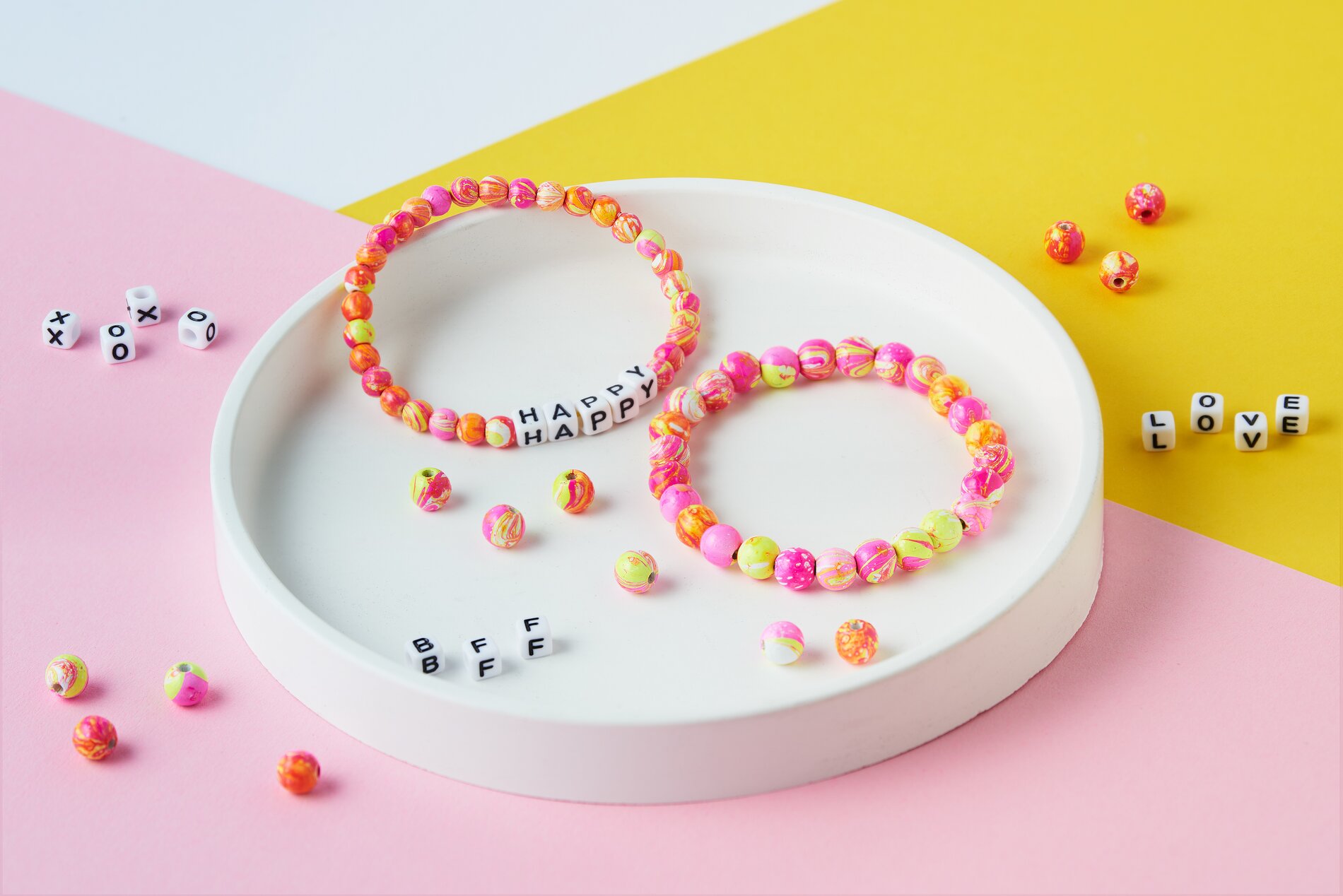 Once the beads are completely dry, you can string them together with the letter beads onto a rubber cord. This creates individual bracelets or necklaces. Finally, close the ends of the elastic cord with a double knot to ensure that your jewelry is stable and durable.