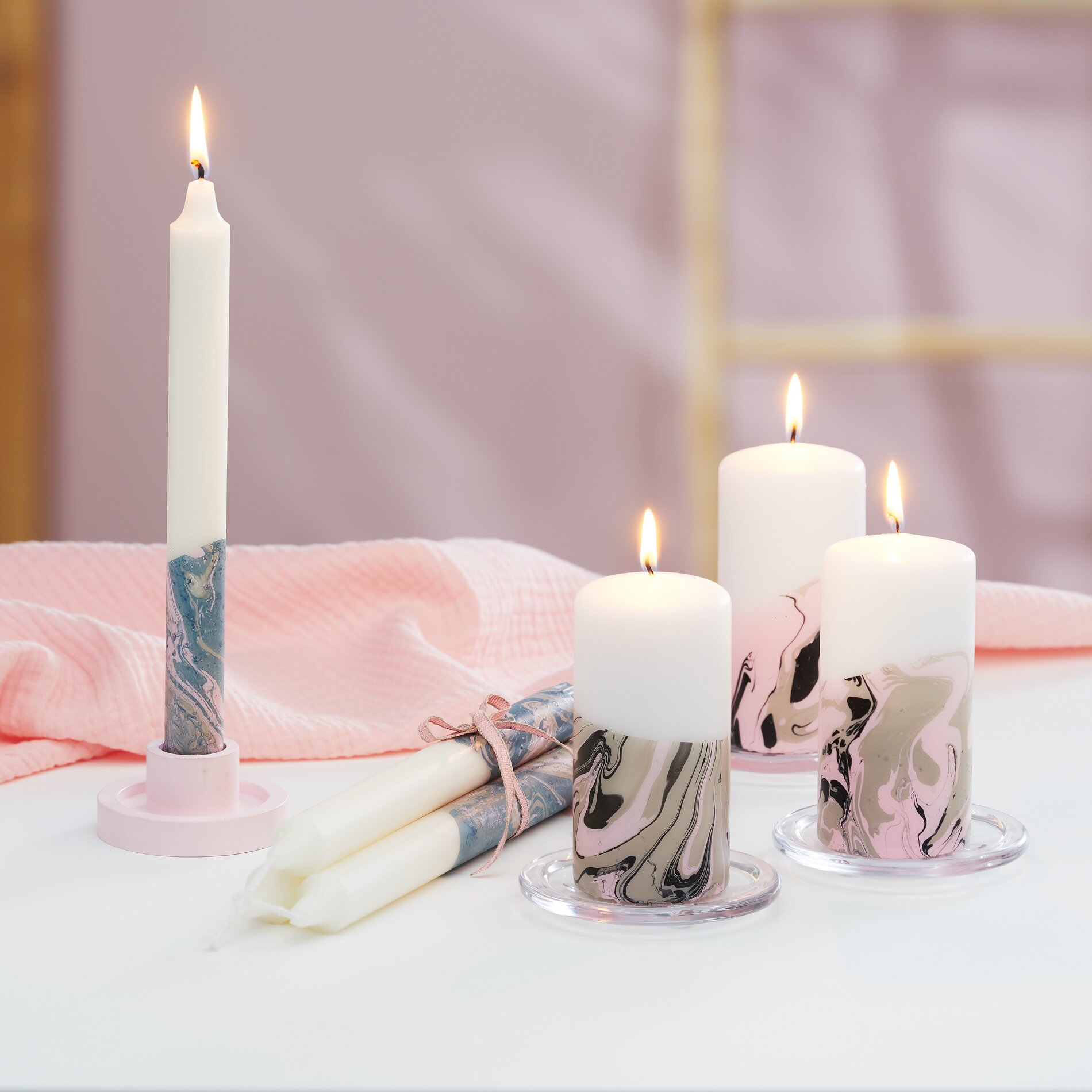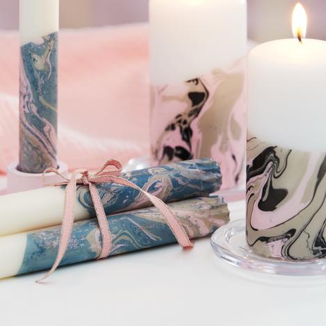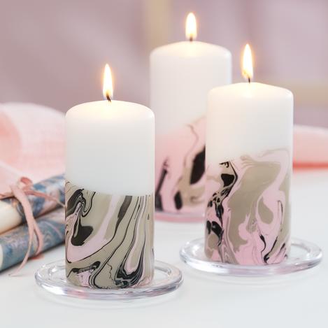 The candles are created using the "dip marbling" technique. Marbling is a particularly pleasant creative pleasure, but it can cause paint splashes and drips.