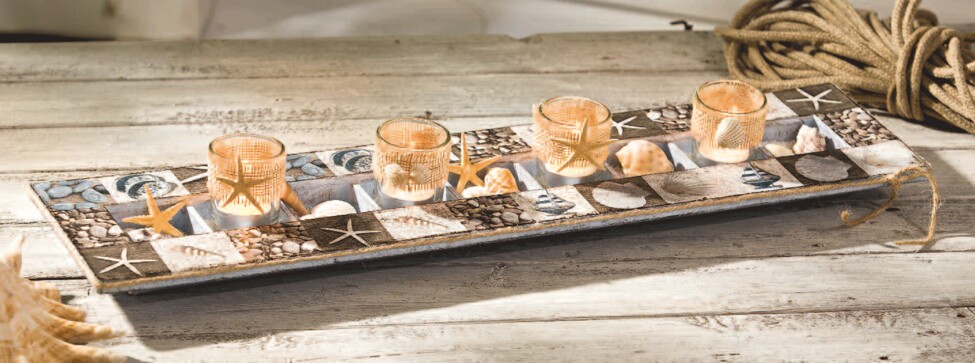 The sturdy papier-mâché bowl with its clear shapes is perfect for designing with The Napkin technique. individual motif fields have exactly the right size for the wide rim. The compartments are decorated with shells and tea lights.