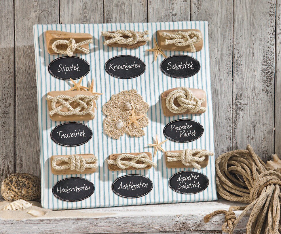 Stick pieces of driftwood and label plates on the with hot Stretched Canvas glue, Sand work it in special-effect blue and apply it to the Stretched Canvas from beach.