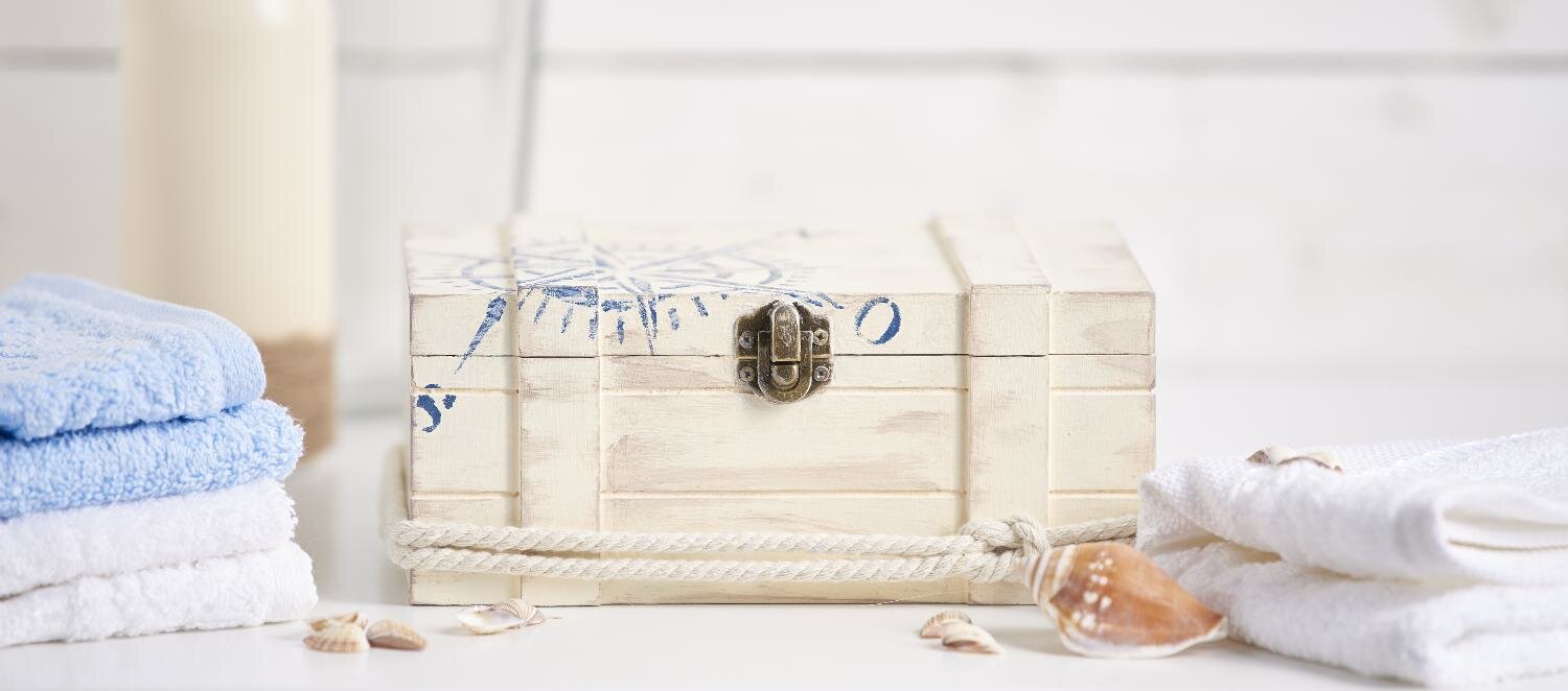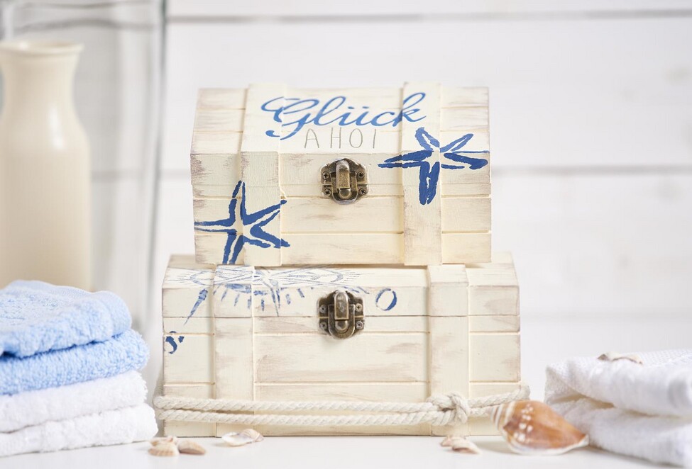 Cotton cordwhich is fixed with hot glue and decorative shells give your maritime treasure chests that certain something.