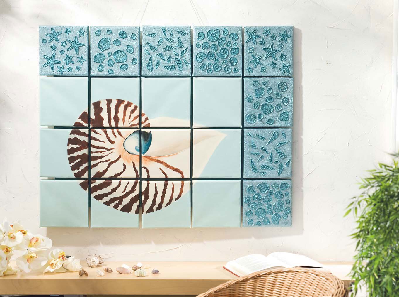 Paint the "background"-Painting board with a muted turquoise shade: mix primary blue with some Sienna fired (3:1) and lighten this mixture with Sand on. For the background of the Nautilus, use primary blue with a lot Sand, for the Nautilus itself only Sand .