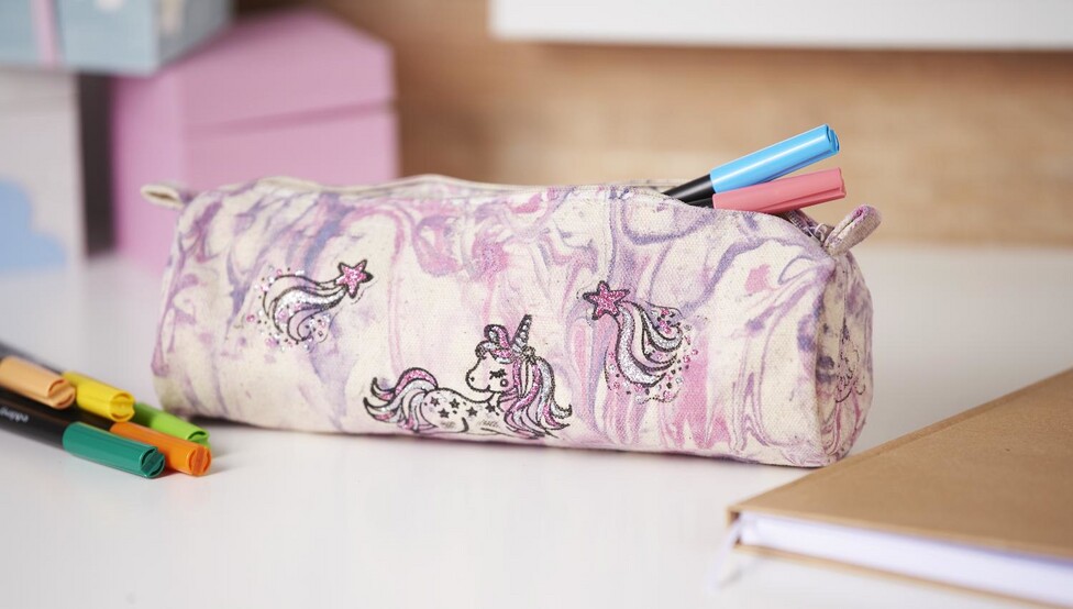 Place your stuffed Pencil case on the edge of your vessel, press it lightly and turn it so that the Pencil case is marbled all over.
