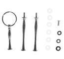 The kit for 3-tier shelves is ideal for connecting shelves with a thickness of approx. 0.5 cm and a hole diameter of approx. 0.6 cm. Included are 3 metal rods, 7 spacers and an end screw. The rods have a length of approx. 11.5 cm including the thread. The ring on the end rod has a diameter of approx. 4.5 cm.