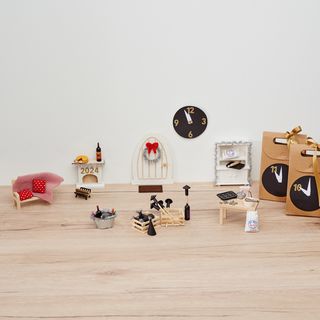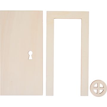 The miniature wooden door has a width of 10 cm x height 13 cm x thickness 0.5 cm. The door is made of natural wood for free painting and design.