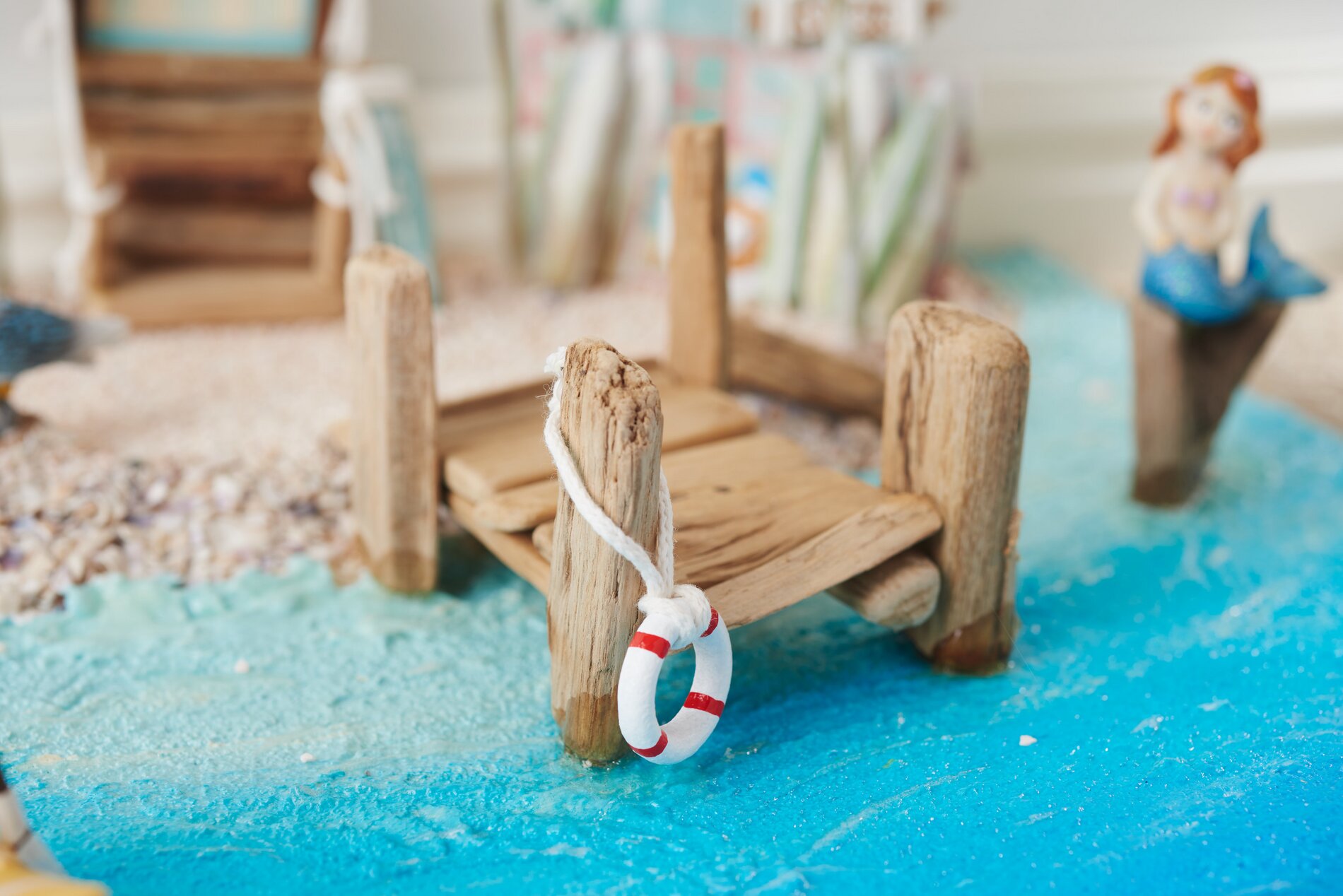Also make the footbridge, the signpost and the "Moin Schild" out of driftwood. Place the mermaid on a piece of driftwood. Paint the door with craft paint and prime the two signs. You can then simply write on them with a marker. Fix the door and the "Moin Schild" to the stairs.