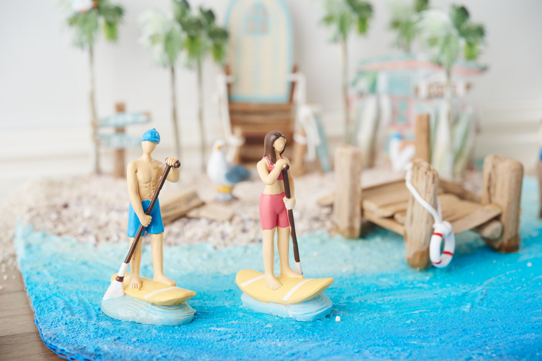Cut out small shark fins from foam rubber. Arrange them and the miniatures on your beach landscape and fix everything with hot glue.