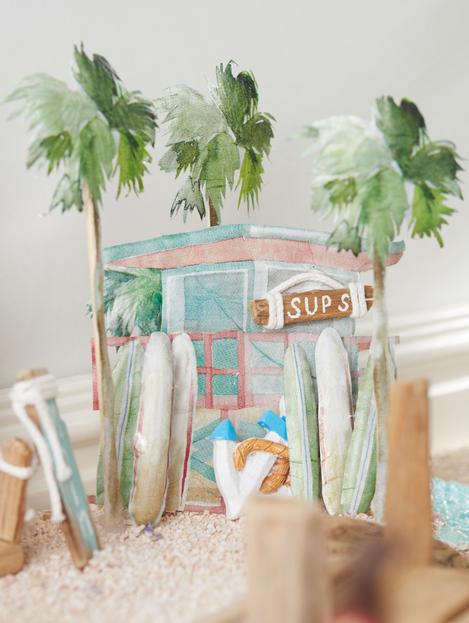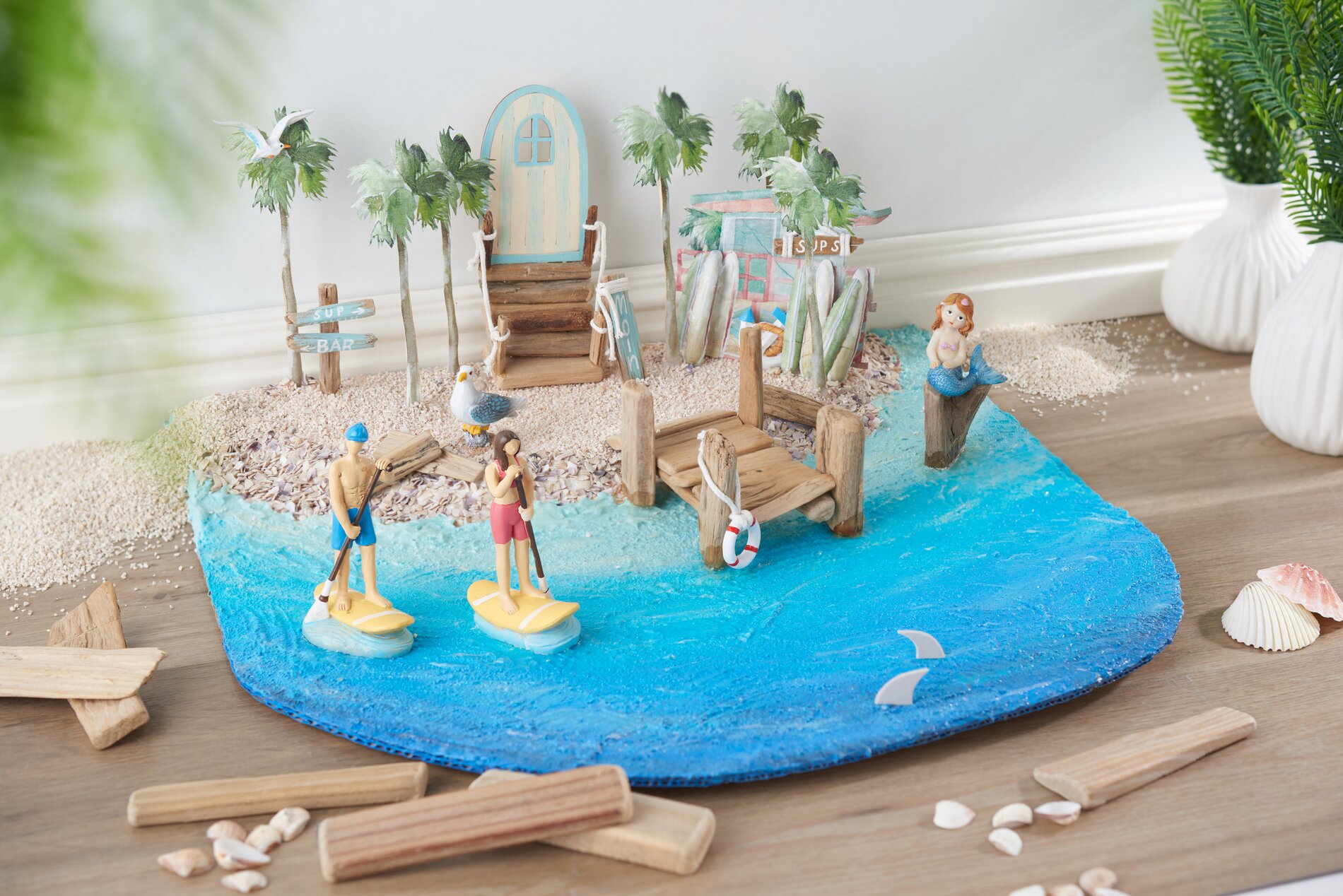 The miniature world is made on a plain corrugated cardboard. Cut a base plate of approx. 30 x 40 cm from corrugated cardboard. Glue two to 3 pieces of corrugated cardboard on top of each other with hot glue as an elevation and this on the corrugated cardboard where the beach is to be created.