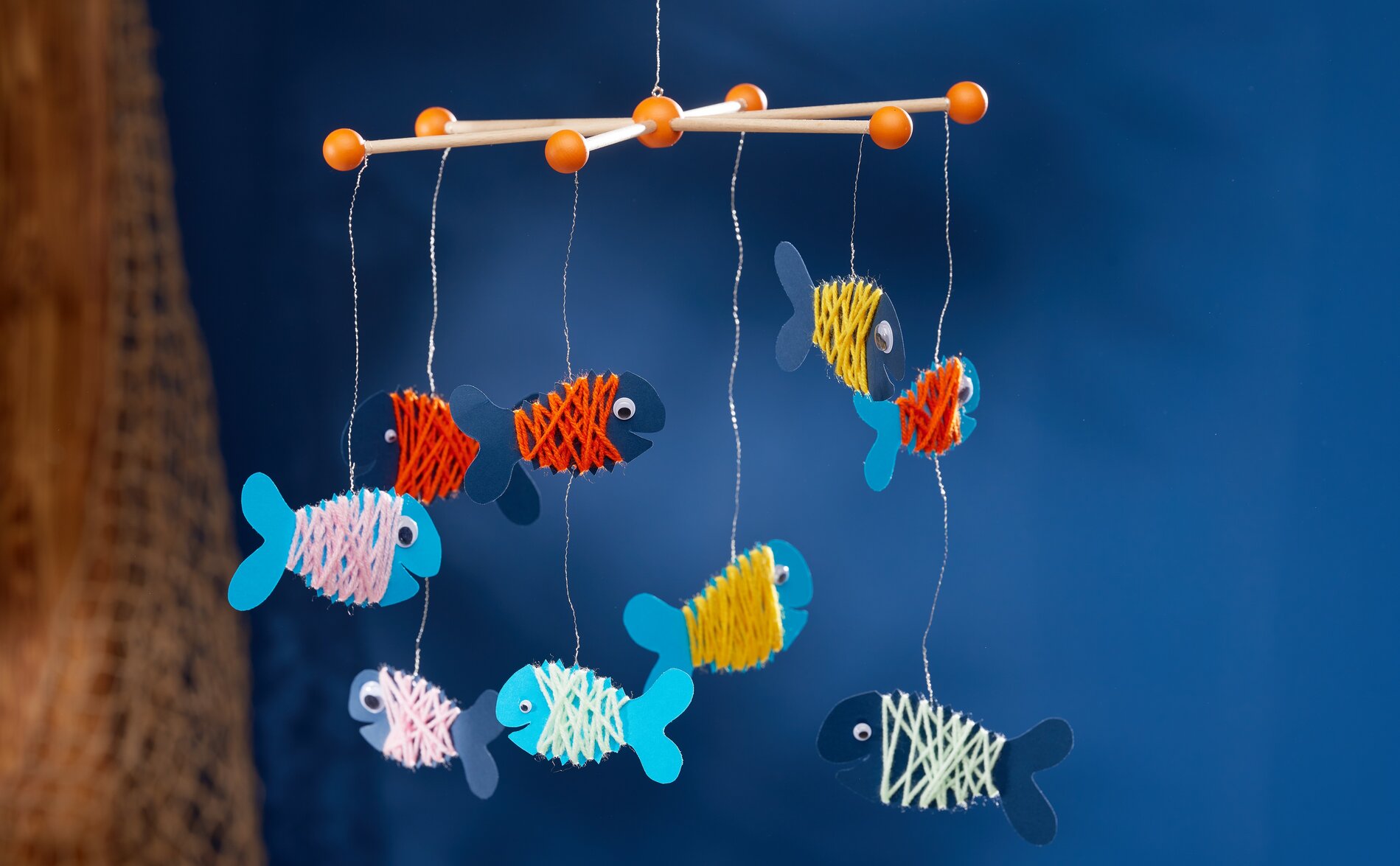 Use this cheerful fish mobilé as an inspiration or template for your new craft project for making things together with children. The fish can also be easily cut out by the little ones and then wrapped with colourful wool.