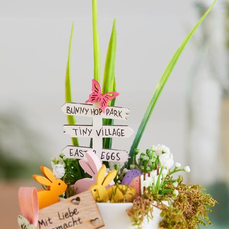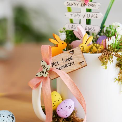 Now decorate the cup with the signpost, fence element and other small decorative accessories such as small Easter eggs, bunnies, flowers and other scattered items. You can easily fix everything in place with hot glue. The "Made with love" sprinkle and a tied bow on the handle of the mug give this decoration that "certain something".